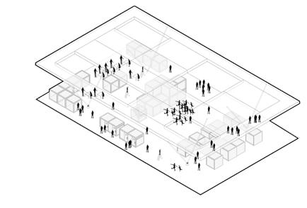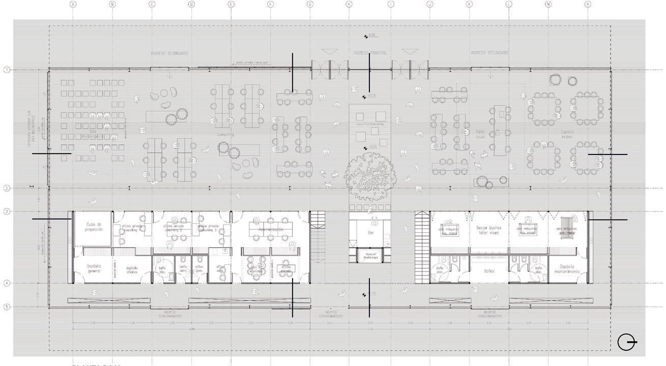 The second space becomes a free ground floor plan, a large multipurpose space to integrate a wide range of activities and presentations. Its flexibility makes possible a meeting and exchange environment, both creative and social to democratize the access to digital manufacturing and new technologies. Most of the interior space remains empty, a void that enhances an existing tree in the center of the proposal, where the main access is located. In this void, a “technical cloud” suspends from a continuous rail with lighting and sound systems, curtains, platforms and elevators to support the multiple layouts of the ground floor.