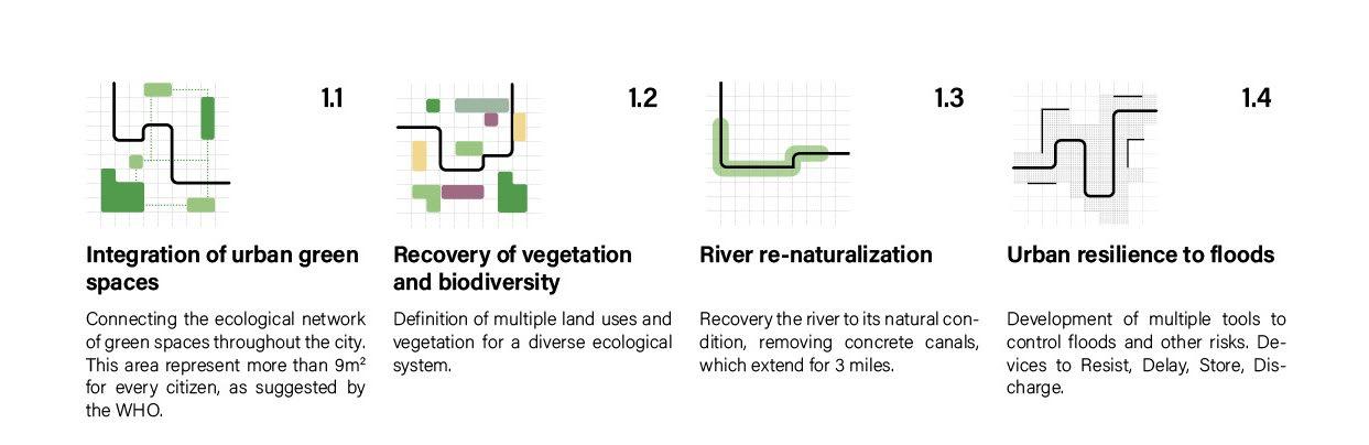The plan is developed through three different scales. [Large]: Territorial study of the entire river across 18 miles. [Medium]: “Priority Projects”, areas where solutions are needed more urgently, with the potential of being major projects of the system. [Small]: “Tool Box”, which contains a series of devices that solve particular issues and that respond to actions such as use, connect, reach, store, clean and resist.