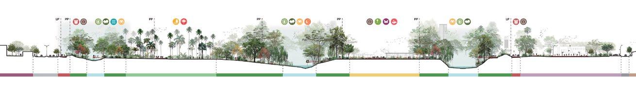 This is achieved through three strategies: [Suture] Connecting and completing the biological network ensuring continuity and connecting with metropolitan ecological system. [Diversify] Restoring and improving biodiversity in existing while promoting new cultural and recreational activities for the community. [Enhance] Making water streams and rainforests accessible to the city, considering its symbolic and social location in the metropolitan region.