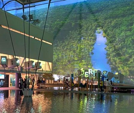 With a steel tensile structure and light white fabric, it creates a screen able to receive projections, creating an immersive atmosphere of variable images, sounds, smells and temperature. It is a place for animations and interaction place with a distinct scenic character. At the same time, it is a visualization and experimentation scenario of nature and cultures, both in the past and in the future.