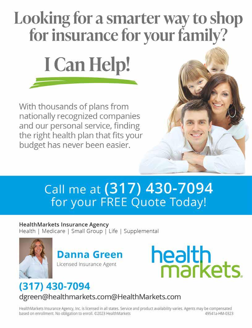 To schedule an appointment or find out more about a free HealthMarkets consultation, call Green’s licensed assistant, Marsha, at 317-695-0856. Green’s office is located at 3100 Meridian Parke Drive, Suite O in Greenwood.