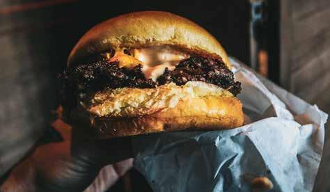 welcoming new visitors, thanks in part to their crowd-pleasing smash burger. Described as the original smash burger by the team, it’s a stack of juicy beef topped with cheese, pickles, house sauce and grilled onions. “This style of burger was the only burger we offered when we started the food truck, and it became a crowd pleaser,” San Agustin says. “It’s still the fan favorite.”