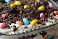 5. Pour the pudding mixture on top of the cream cheese layer, spreading it evenly. Sprinkle the remaining crushed Oreo cookies over the pudding layer. Top with pastel-colored candy-coated chocolates and mini Oreo cookies for decoration. Cover the casserole with plastic wrap and refrigerate for at least 4 hours or overnight to set. Cut & Enjoy!