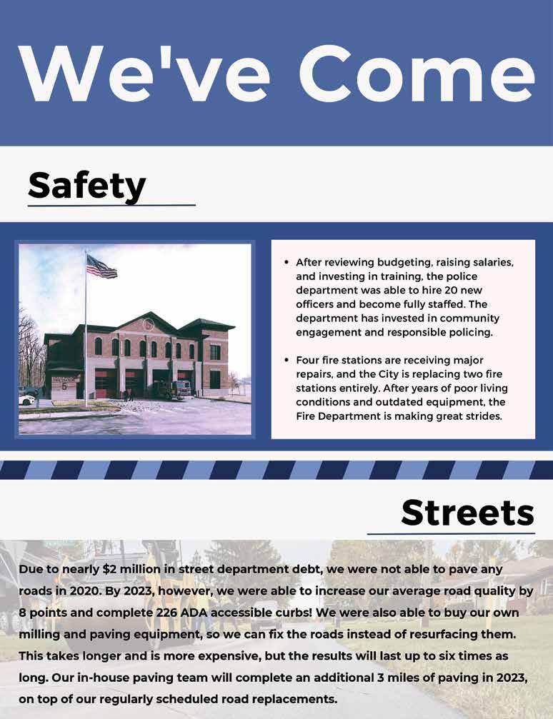 I n 2 0 2 0 , t h e P o l i c e D e p a r t m e n t w a s s h o r t b y 2 0 o f f i c e r s , a n d c o u l d n ' t p r o v i d e a d e q u a t e s a l a r y r a i s e s . T h e F i r e D e p a r t m e n t w a s i n d e s p e r a t e n e e d o f u p d a t e d e q u i p m e n t a n d b e t t e r c o n d i t i o n s i n t h e f i r e s t a t i o n s .