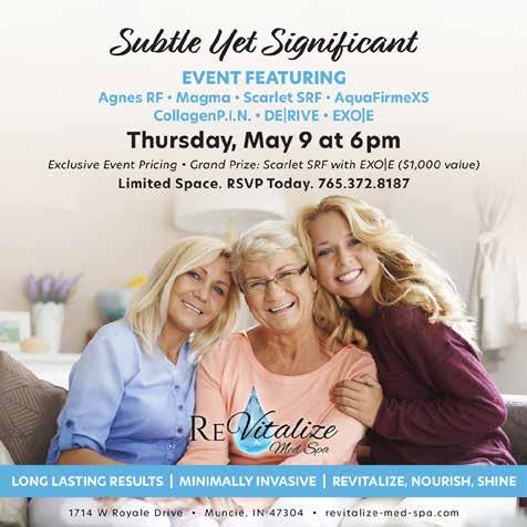 32 | May 2024 | TownePost.com 4 Muncie Locations 765-288-1981 www.voguecleaner.com Expert preservation by Your once in a lifetime gown should last a lifetime! 4100 W. BETHEL AVE., MUNCIE INSIDE VOGUE CLEANERS, NEXT TO MANCINO’S 282-5322 Expert Alterations & Repairs 4 Locations | 765-288-1981 TUX FREE Shoes with Rental! WE SERVE YOU LIKE FAMILY ENJOY OUR OUTDOOR PATIO SEATING! 3901 N. Broadway Ave | Muncie, IN 47303 | 765-288-8897 Order Online: puertovallarta-muncie.com COME CELEBRATE MOTHER’S DAY WITH US!