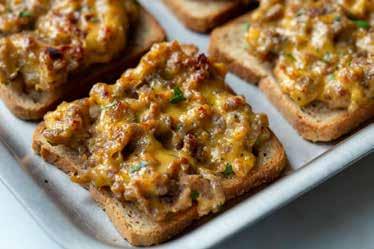 8. Place a 2-tablespoon-sized scoop of the cheese and meat mixture onto each slice of bread, spread out to cover most of the bread slice.