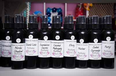 “I’m about the customer,” Lori says. “What makes the customer happy is the product inside that bottle.” Many designer perfumes sell for hundreds of dollars for a similar size. At Wicked Trio, customers get an essence version of their favorite fragrance at a fraction of the cost, often in formulas that last even longer on the skin. Body butters, whipped scrubs, bath salts, shaving butter, aroma beads, room sprays, roller-ball perfumes, car fresheners, diffuser oils, solid perfumes, pain rubs and more have followed. Most are made with natural butters and oils, with color added only to wax products. Lori is candid with customers about fragrance sensitivities and uses essential oils when she can, while still offering the wide variety of scents people request.