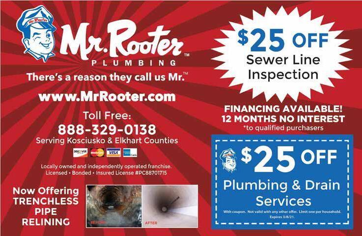 4 / THE LAKES MAGAZINE / APRIL 2023 / TownePost.com WWW.TIMBERVALLEYCLEARING.COM (INCLUDE WEBSITE IN AD) BOURBON, IN 260-610-3538 “COMBAT VETERAN OWNED AND OPERATED” EXCAVATING, LAND CLEARING, FENCE ROWS, BRUSH TRAILS, & IRRIGATION LANES. EXCAVATING • LAND CLEARING • FENCE ROWS BRUSH TRAILS • IRRIGATION LANES 260-610-3538 WWW.TIMBERVALLEYCLEARING.COM COMBAT VETERAN OWNED AND OPERATED There’s a reason they call us Mr.™ PLUMBING Toll Free: 574-213-0485 Serving Kosciusko & Elkhart Counties Now Offering TRENCHLESS PIPE RELINING Locally owned and independently operated franchise. Licensed • Bonded • Insured License #PC88701715 $ 25 OFF Sewer Camera Inspection FINANCING AVAILABLE!