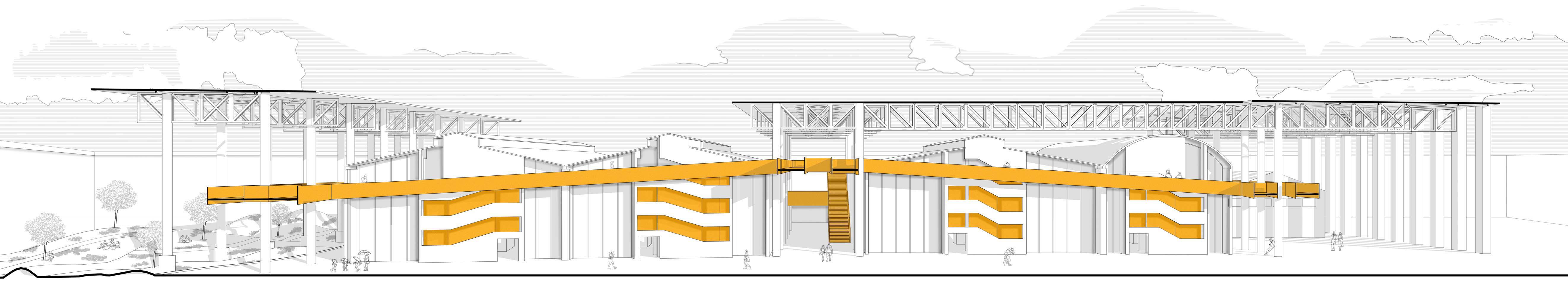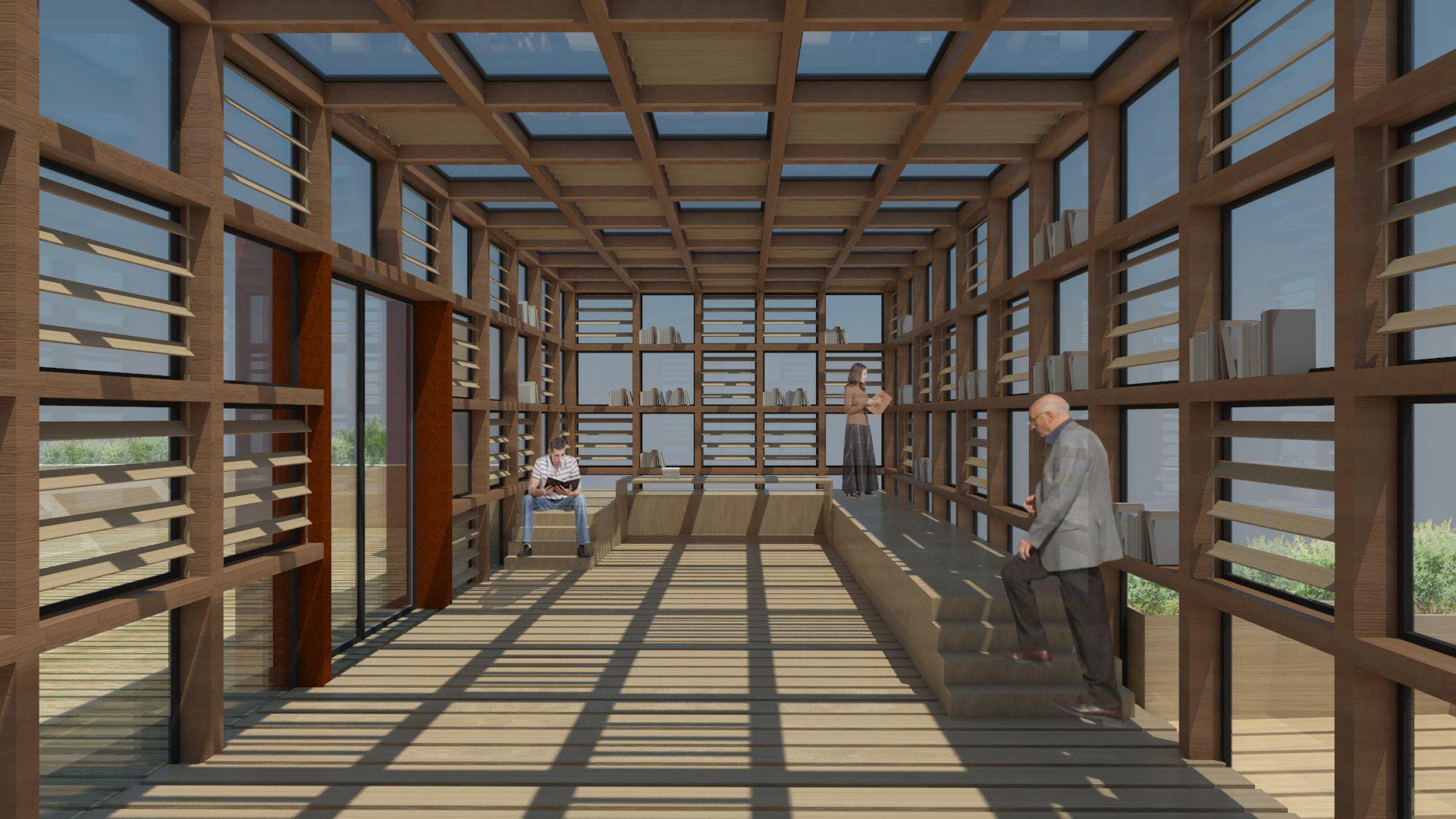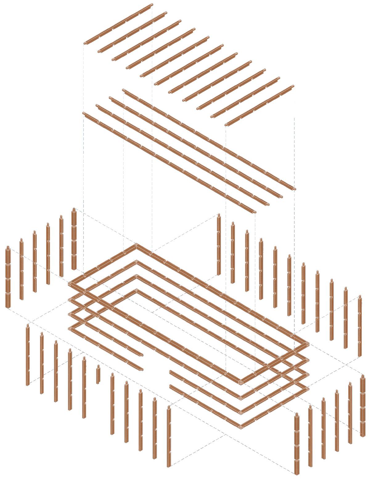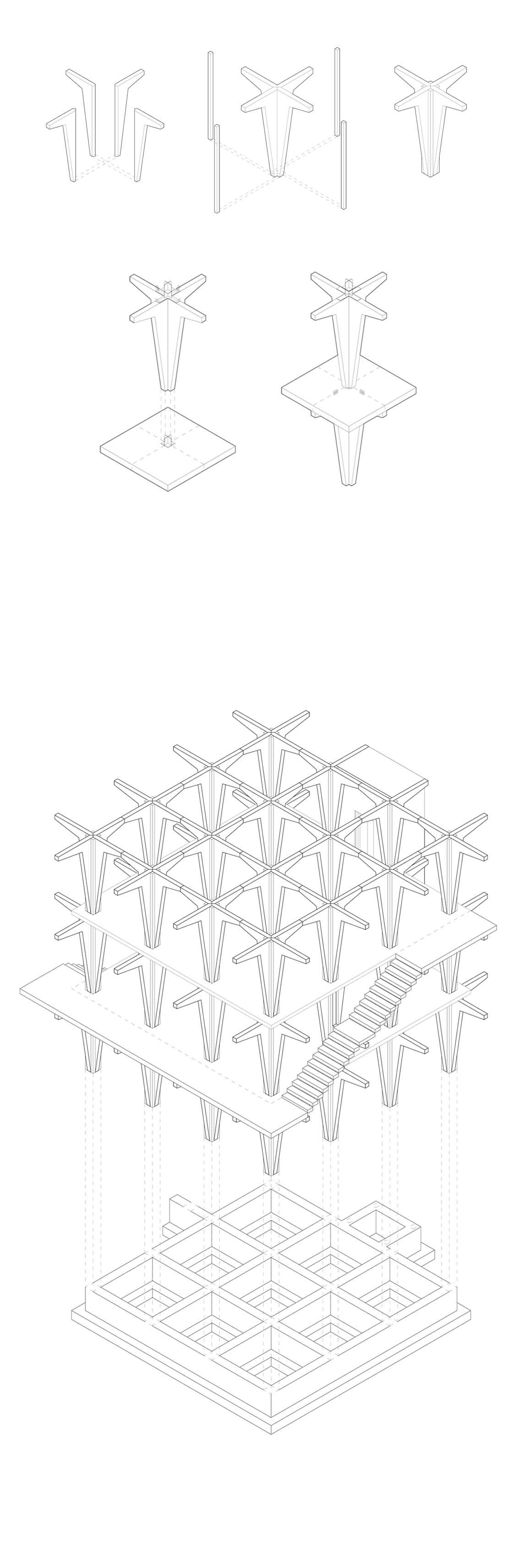 The first is a structural mesh of prefabricated and interlocked IPE and C-shaped beams in GFRP reinforced polymer. The library is the second part of the structure. Made entirely of wood it is made up of interlocking wooden beams.