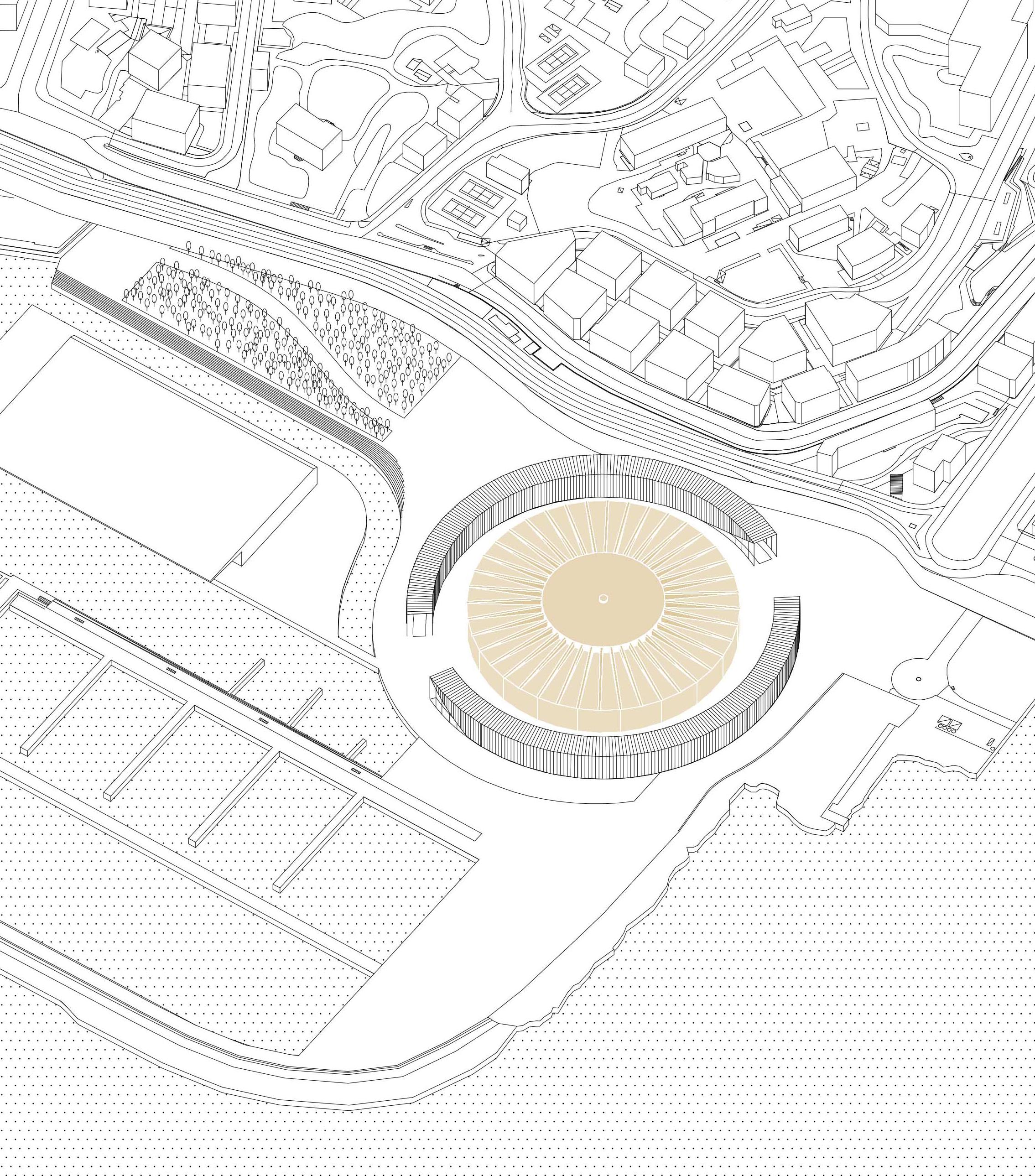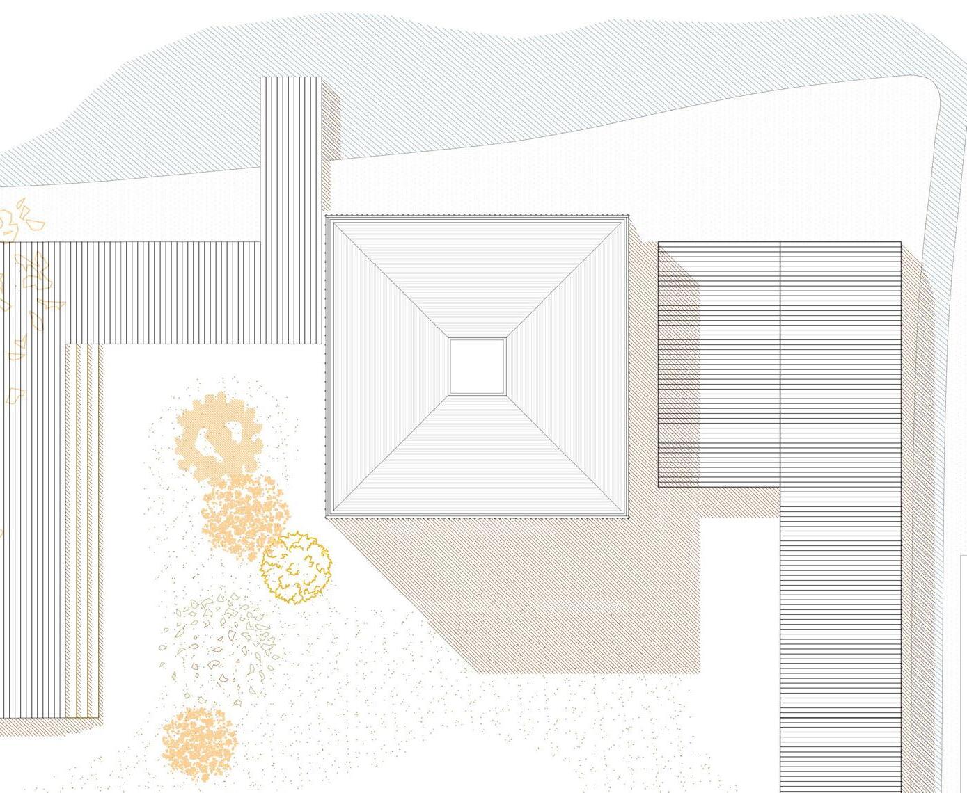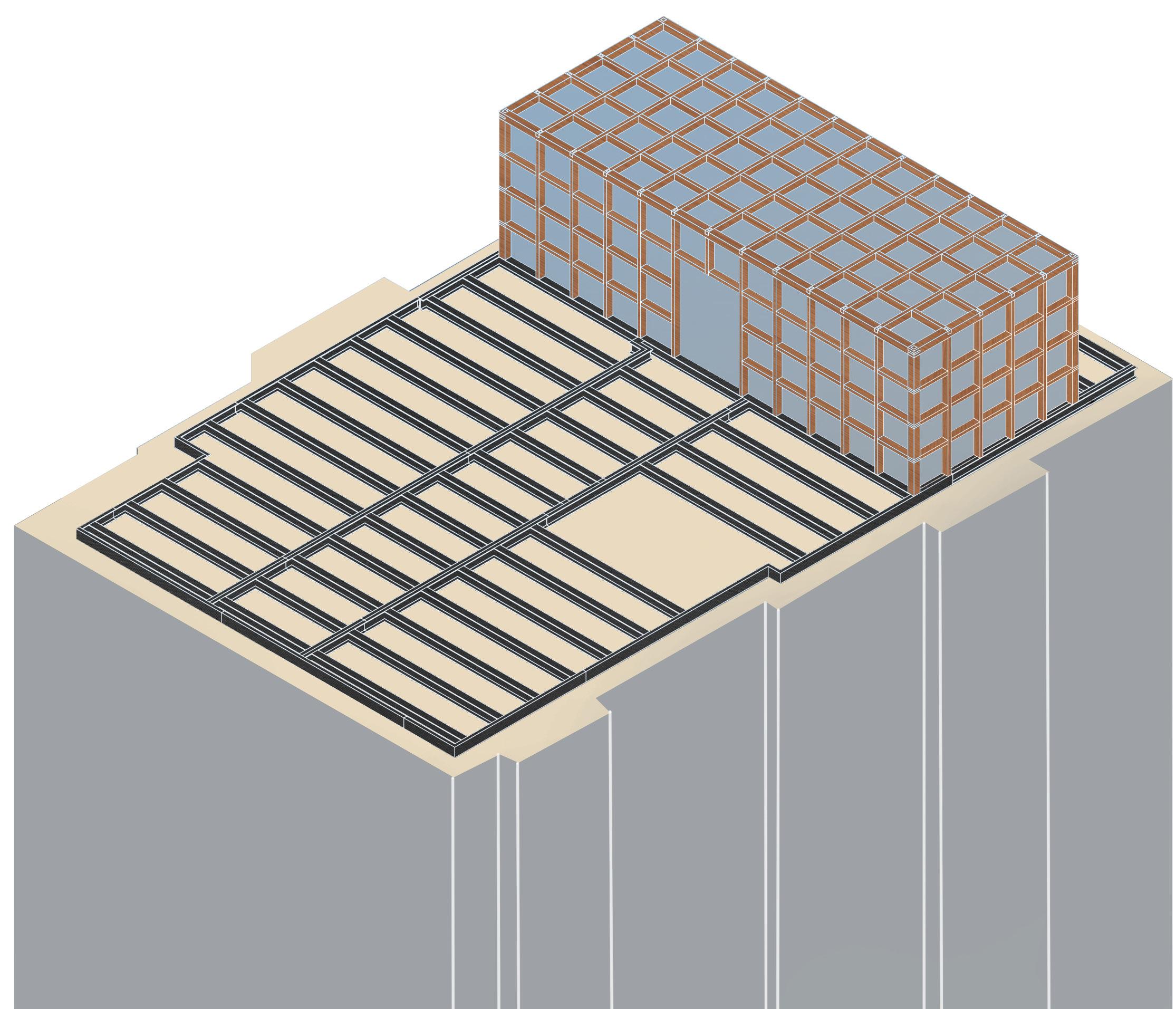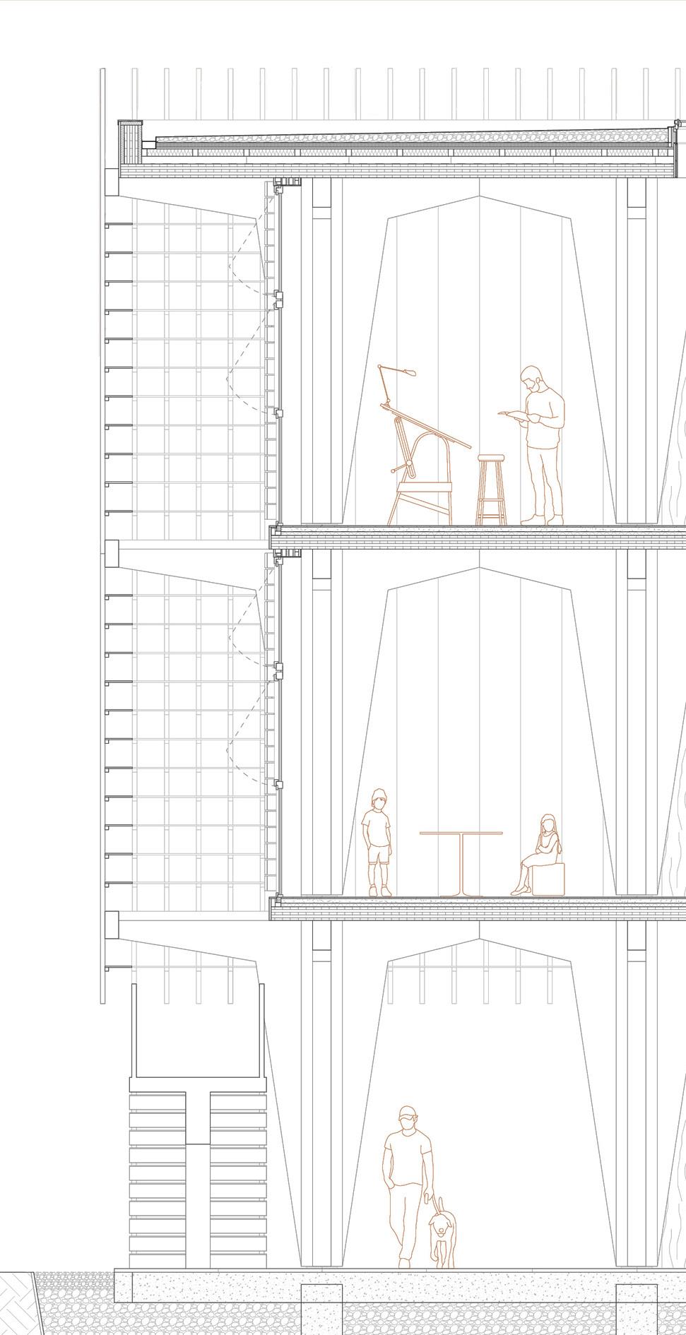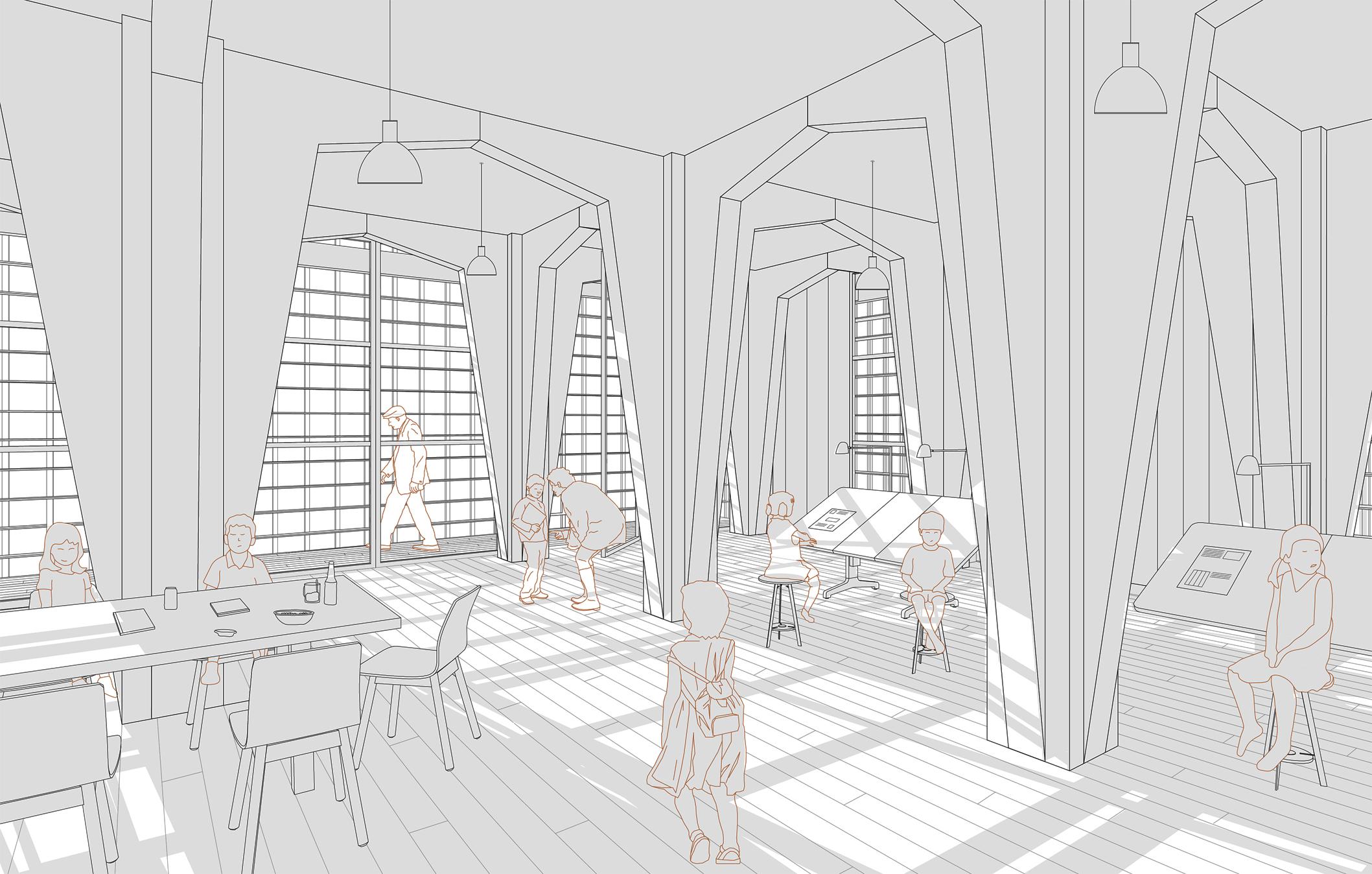 The first is a structural mesh of prefabricated and interlocked IPE and C-shaped beams in GFRP reinforced polymer. The library is the second part of the structure. Made entirely of wood it is made up of interlocking wooden beams.
