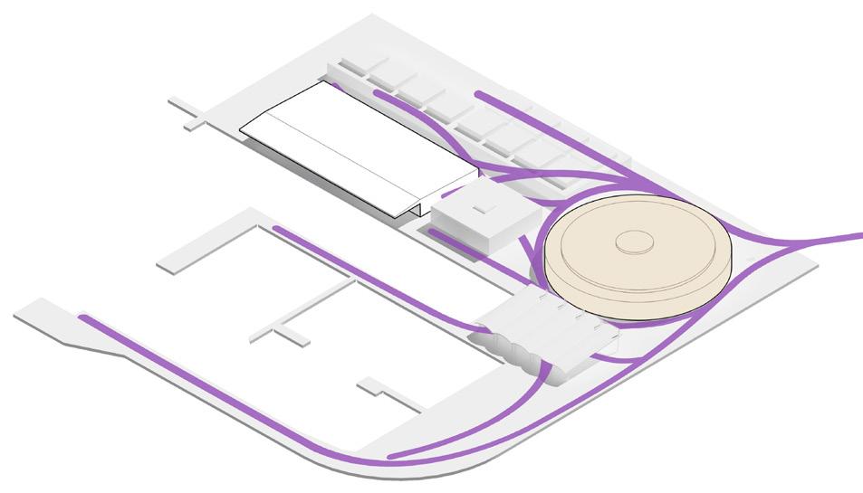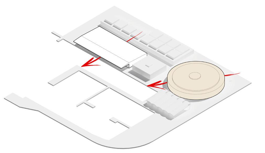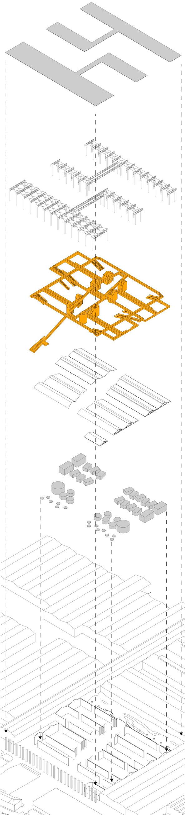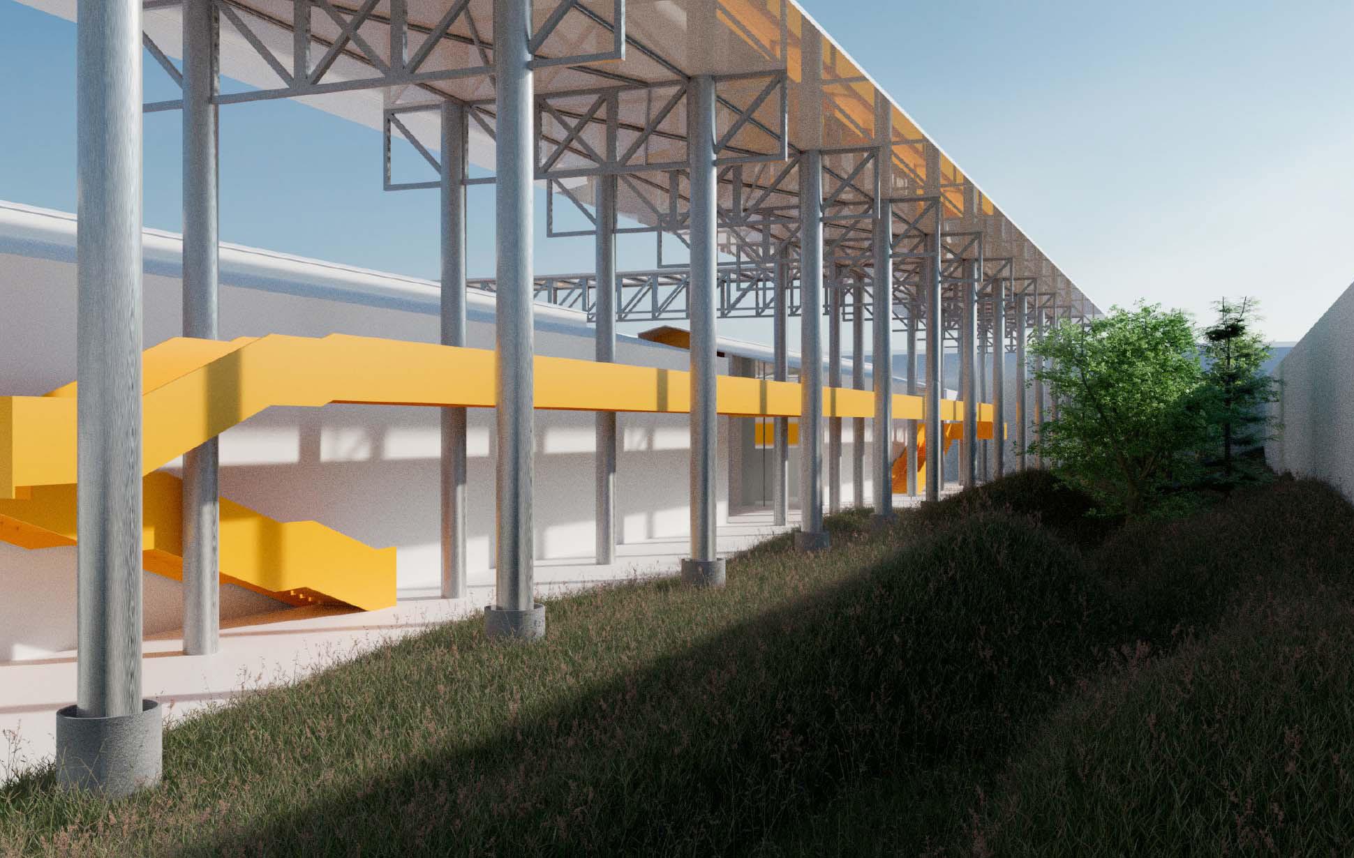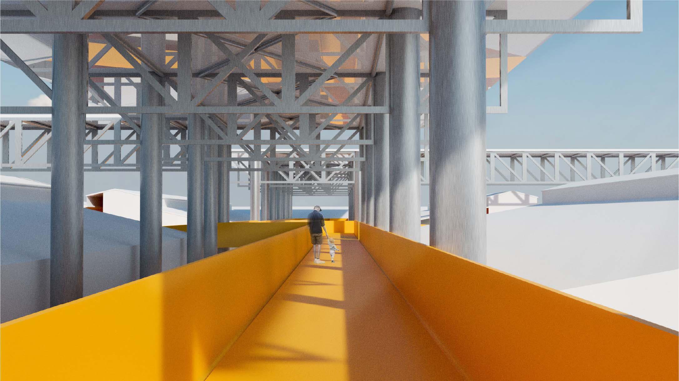 The project aims to restore new spaces to the city and citizens of Dalmine. Thanks to an initial study of the productive processes of the Tenaris factory, which located the production areas to the east and west, it was possible to recognize storage environments, not used for a productive role, and therefore potentially recoverable. The emptying of these warehouses has opened a long public corridor that opens towards the city. The connection system with the existing urban system develops through systems of walkways, supported by a roof made of reticular beams, which reach suitable heights (4.5 and 9 meters) to allow alternative access to the sheds both at the head and at its sides without cutting the arteries of the factory. The sheds house exhibition spaces in the factory, university classrooms and offices, with a play of volumes that fit inside them. At the two heads of the system there are instead an outdoor park and a station that allows the connection with Verdello Dalmine, which are articulated through spaces and squares open to citizens.