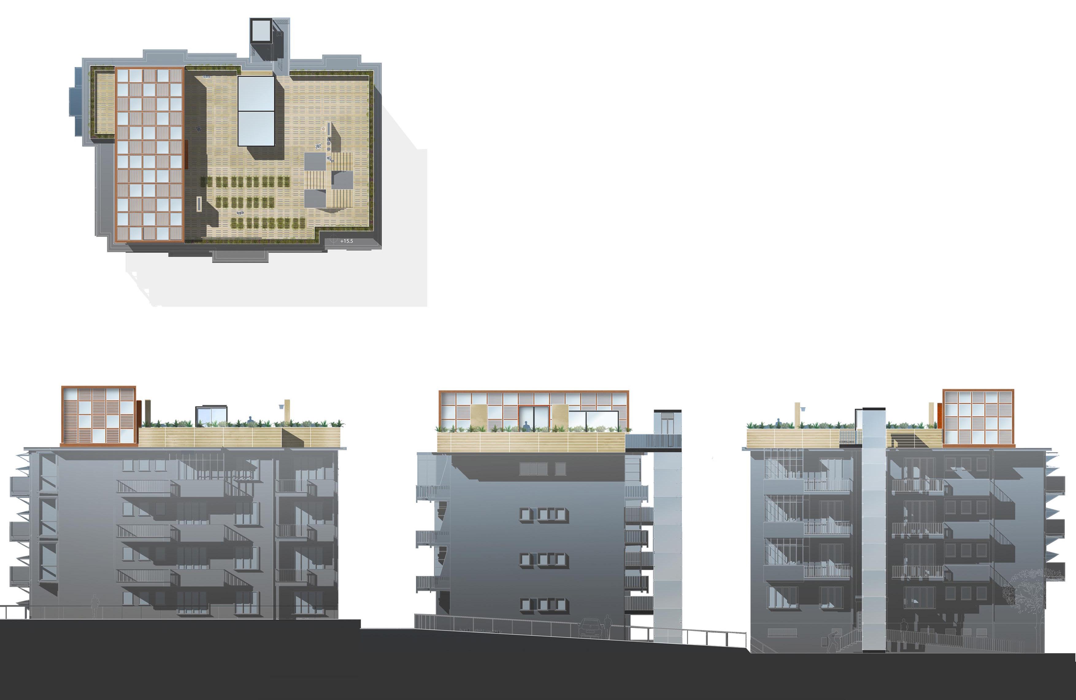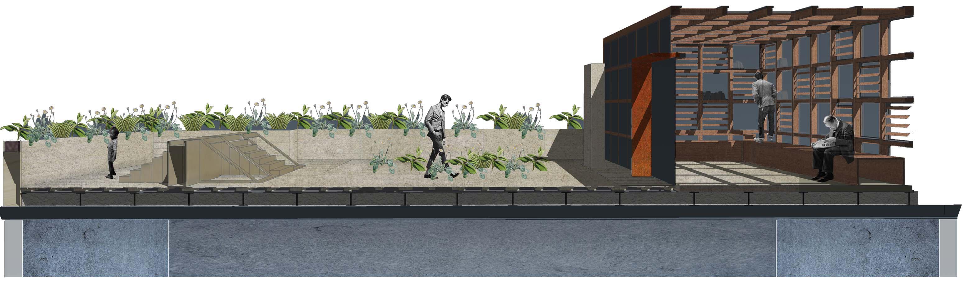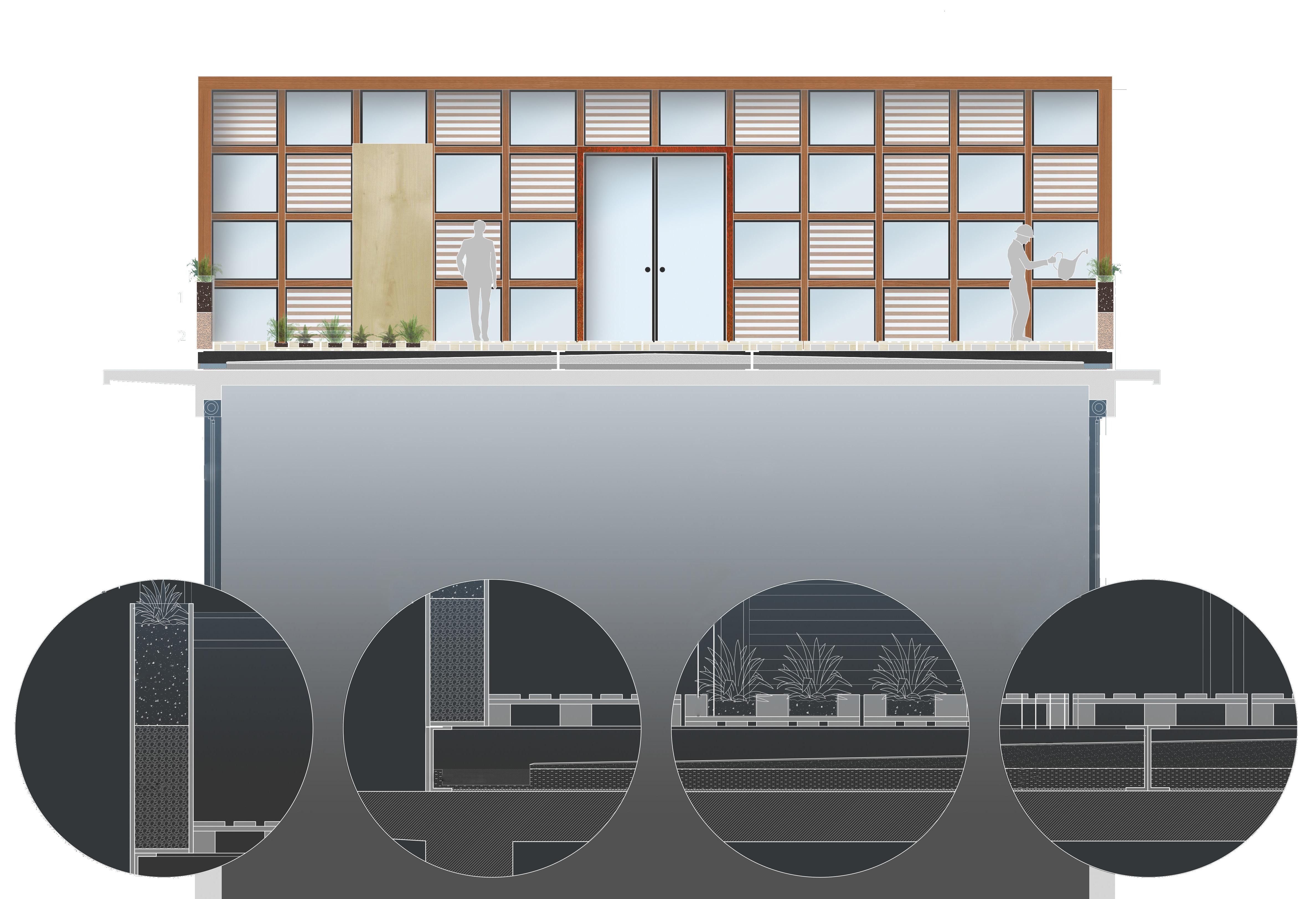 The process is divided in two phases. In the first one, the preexistance is secured, making walkable the rooftop’s surface. To make that a mash has been used, made by beams on the market with standard measures in GFRP material, a reinforced polymer. The distribution of the spaces has been studied instead in the second phase. The surface has been divided into 3 recreational zones: the first one, an open library, the second one a playground area for kids, and eventually a botanical garden cured by the residents of the building.