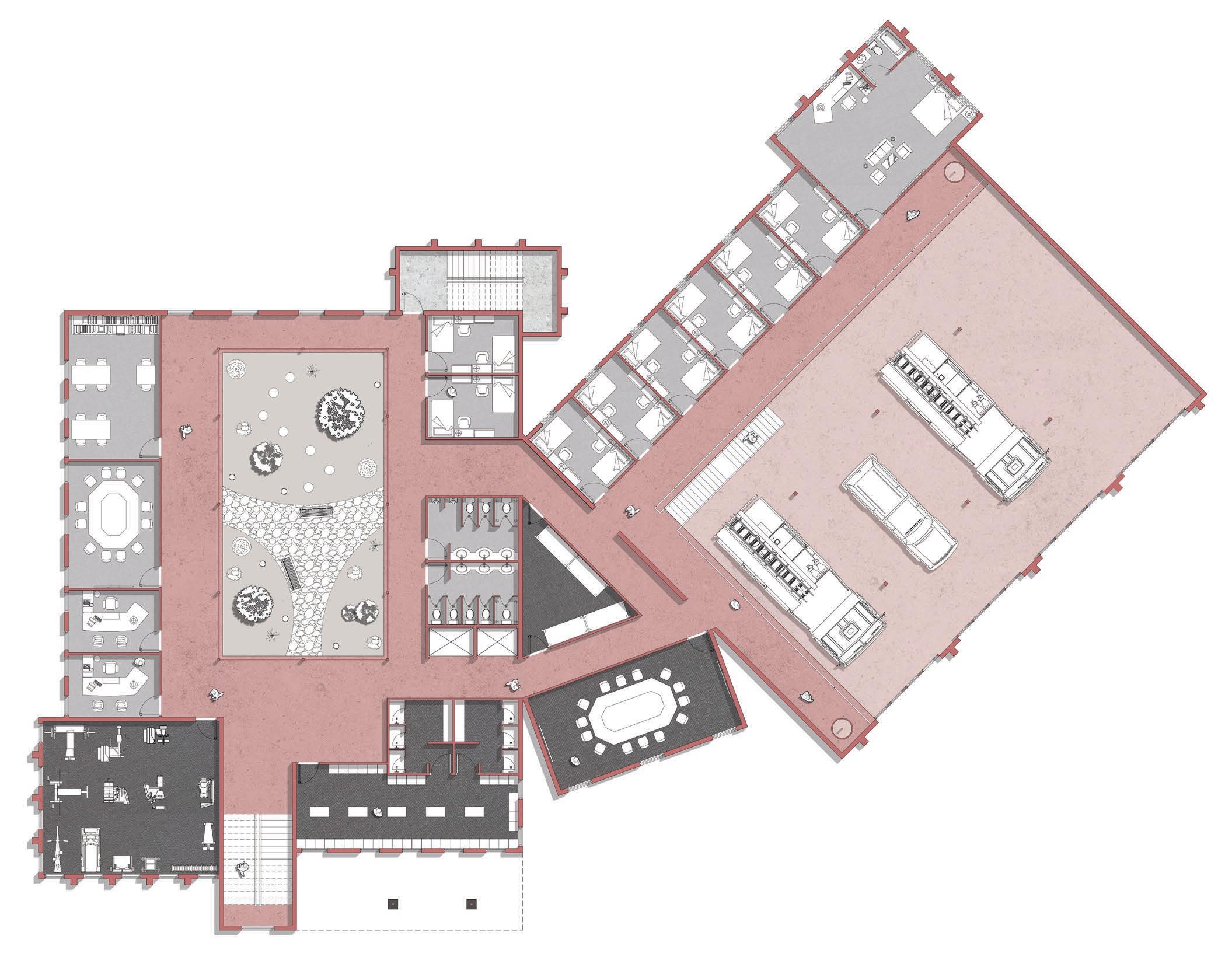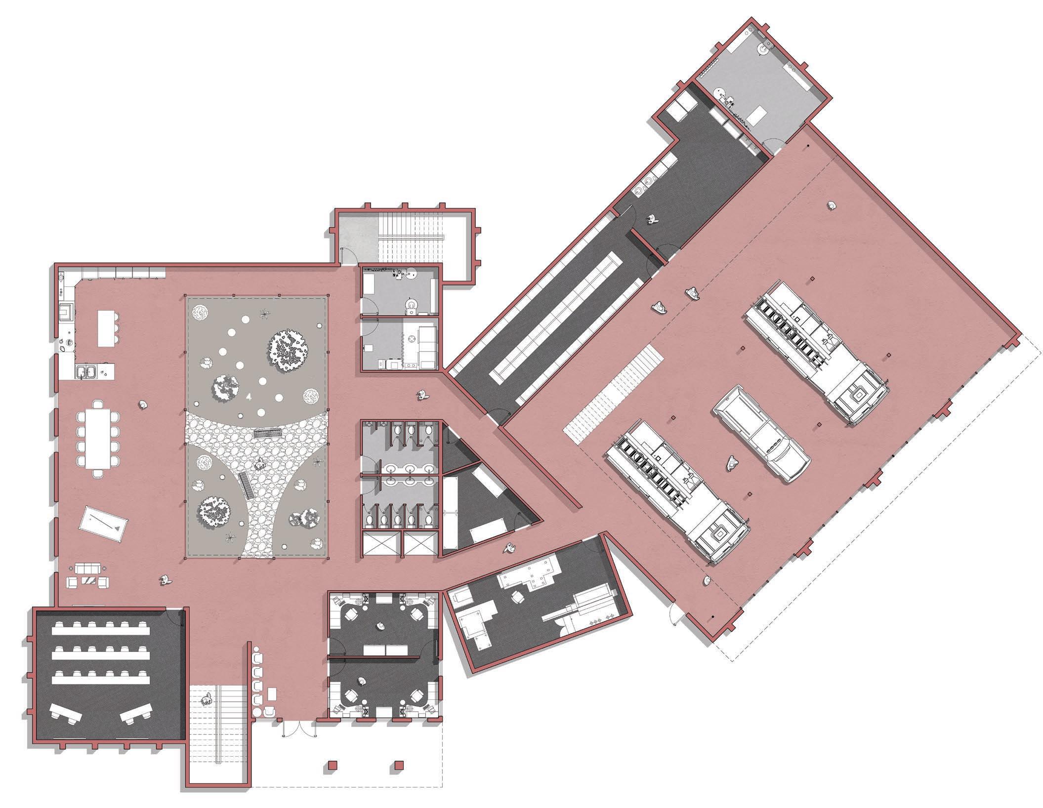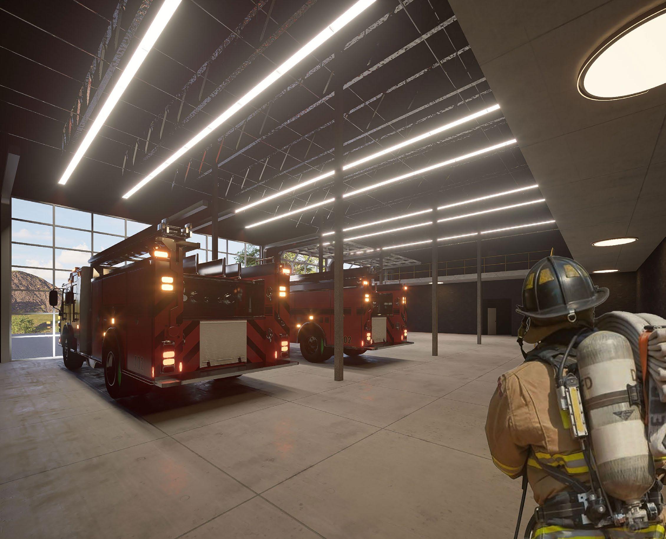 The design of the fire station subtly integrates architectural characteristics found in castles and fortresses, including an irregular plan layout, elevated tower elements articulated with fortifying merlons, and a protected interior atrium enclosed by its surrounding walls. Prominent programmatic spaces include an interior garden, multiple office and meeting rooms, bunk spaces, a gym, and an expansive apparatus bay interrupted by a mezzanine level. Together, these spaces balance operational efficiency with moments of respite and care.