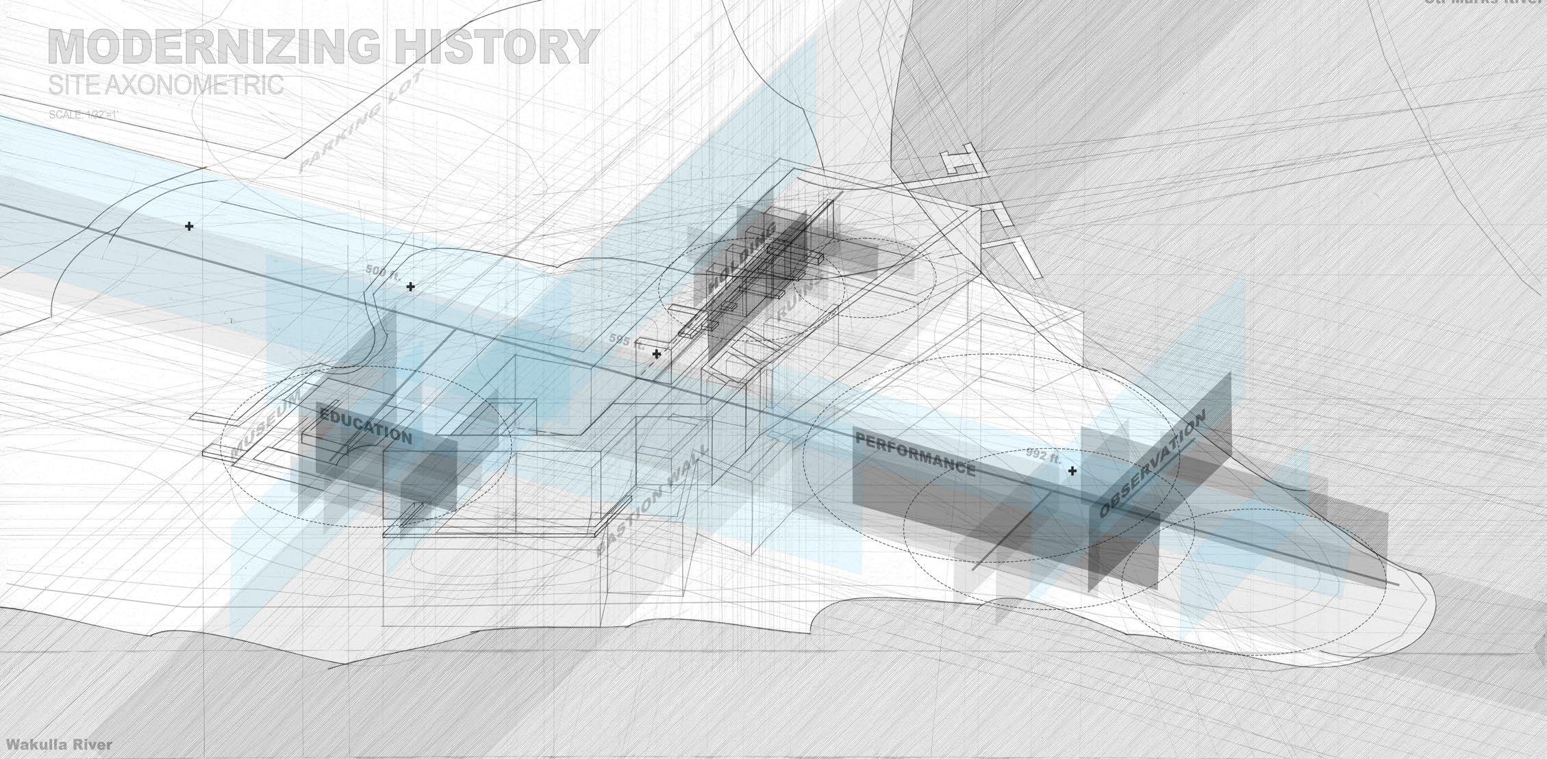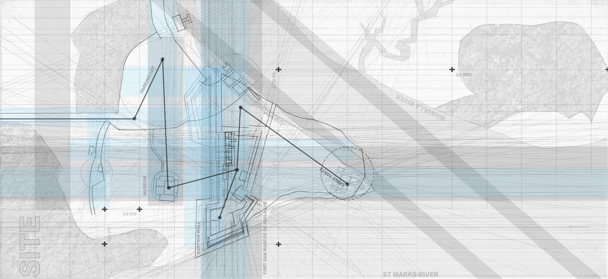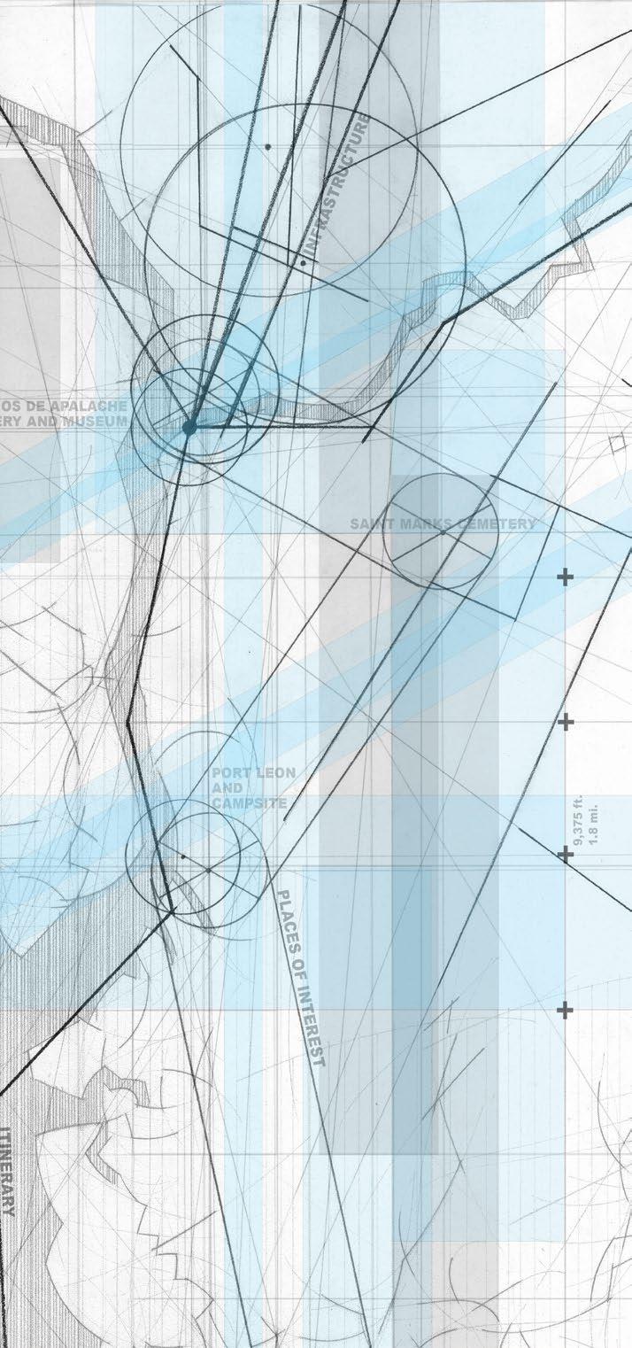 Through an examination of regional, local, and site mappings of Fort San Marcos de Apalache, this project identifies critical hydrological, urban, and ecological boundaries that have shaped the fort’s historical and contemporary presence. These layered readings informed the development of a site axonometric, establishing a framework for strategic future interventions and a deeper understanding of the site’s topography. The proposal unfolds through the restoration of the fort as a catalyst for sustainable tourism, reactivating these often-overlooked colonial ruins while preserving their historical and cultural significance. By blending careful preservation with immersive public engagement, the project reintroduces human presence as a means of continuity, allowing the fort to evolve as a living landscape shaped by both memory and use.