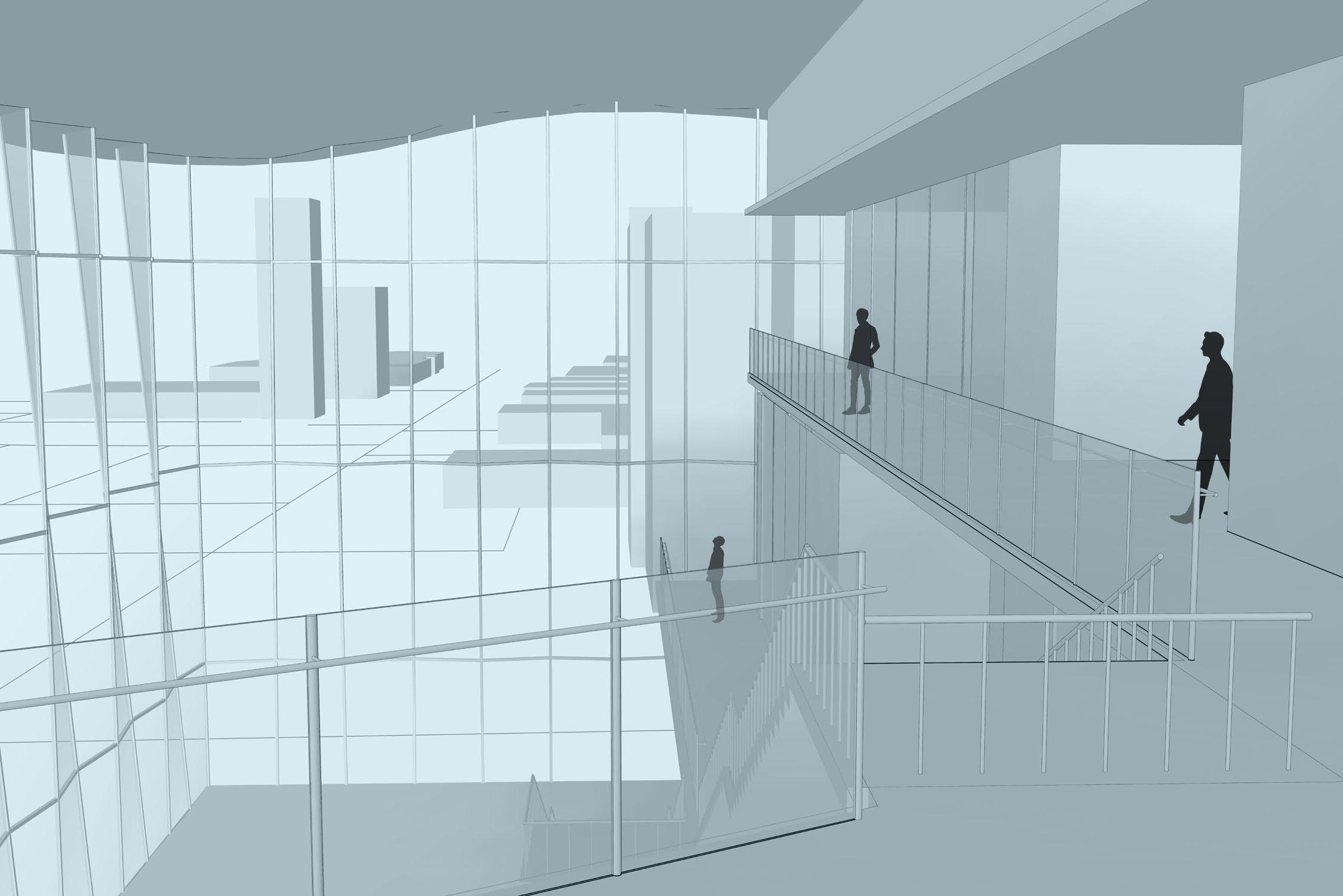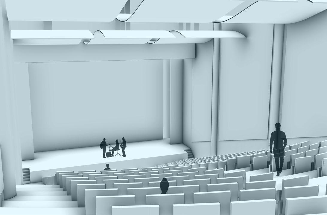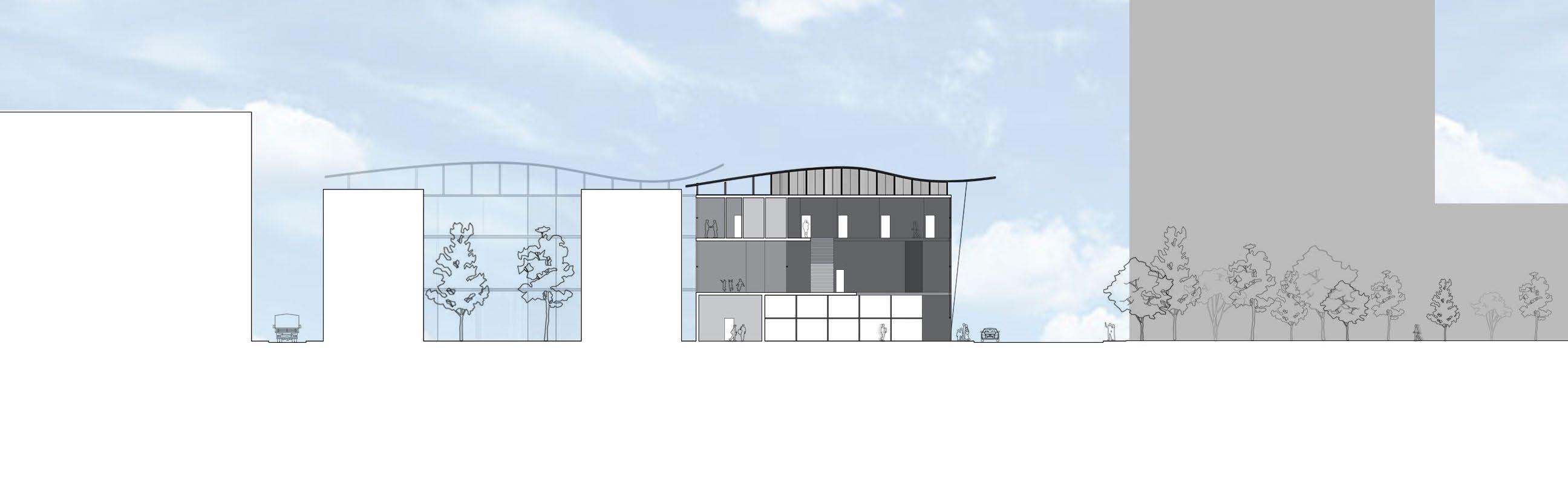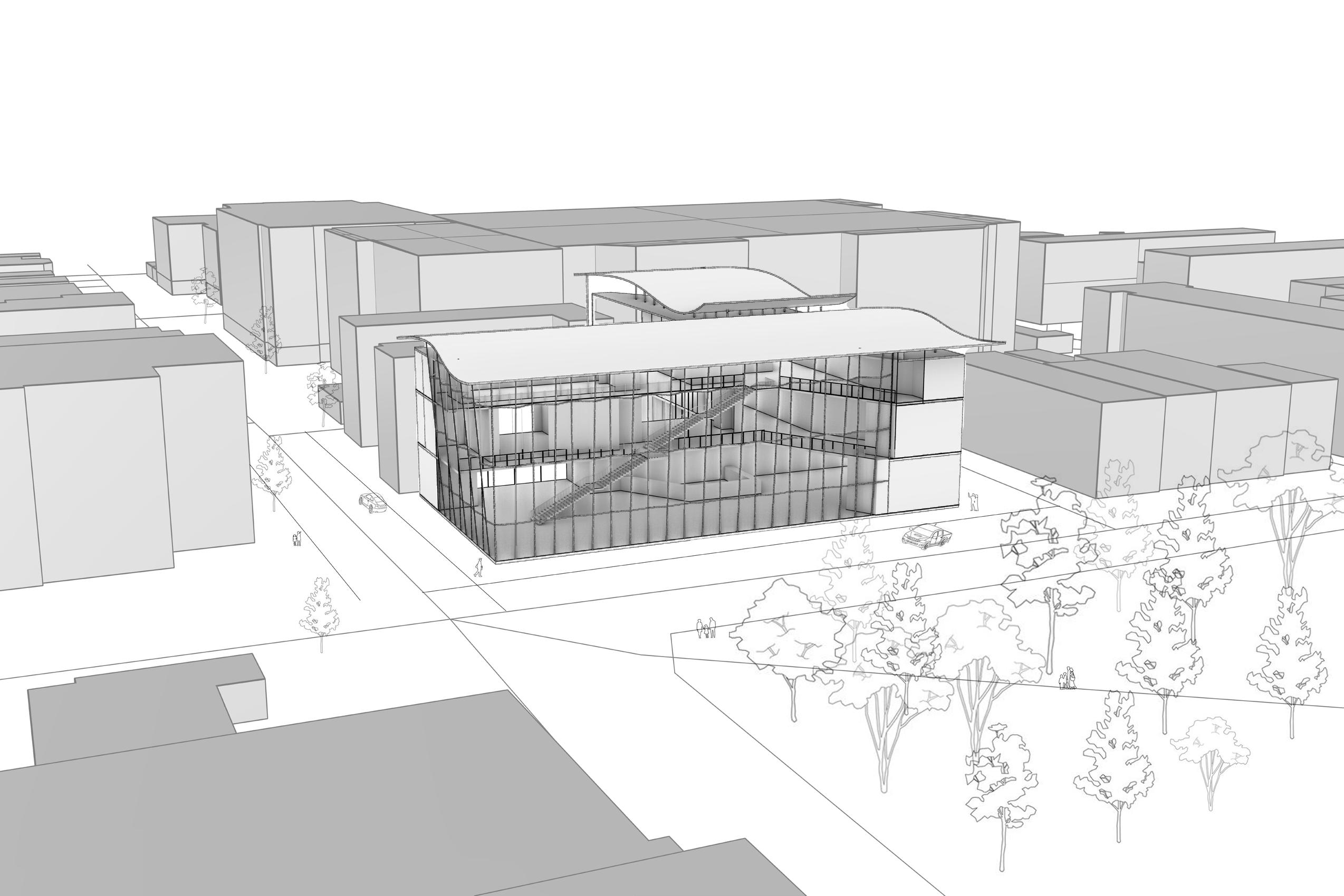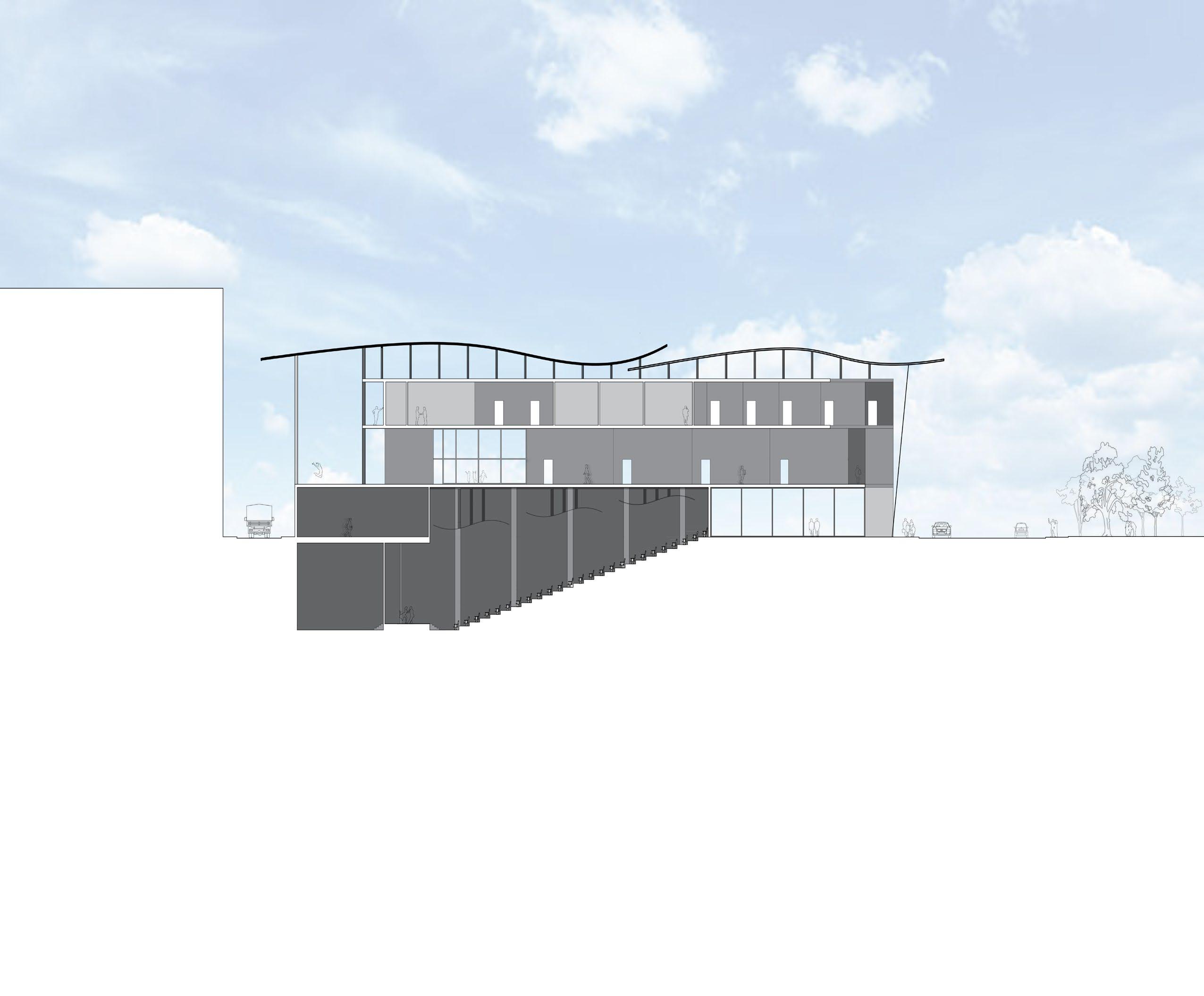 Visually, the building’s form and façade evoke the presence of a theatrical stage, visible from surrounding sidewalks, neighboring structures, and nearby parkland. Its dynamic, flowing roofline captures the energy and rhythm of the performing arts, embodying the spirit of the activities