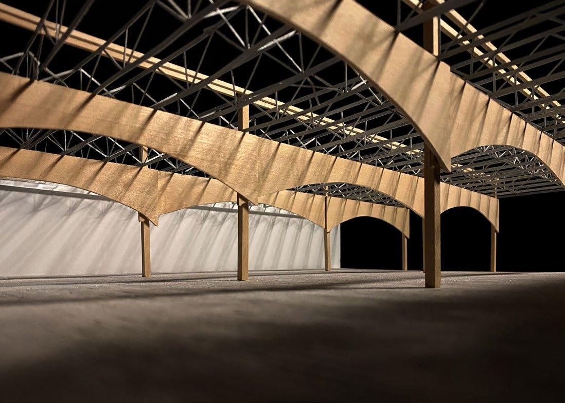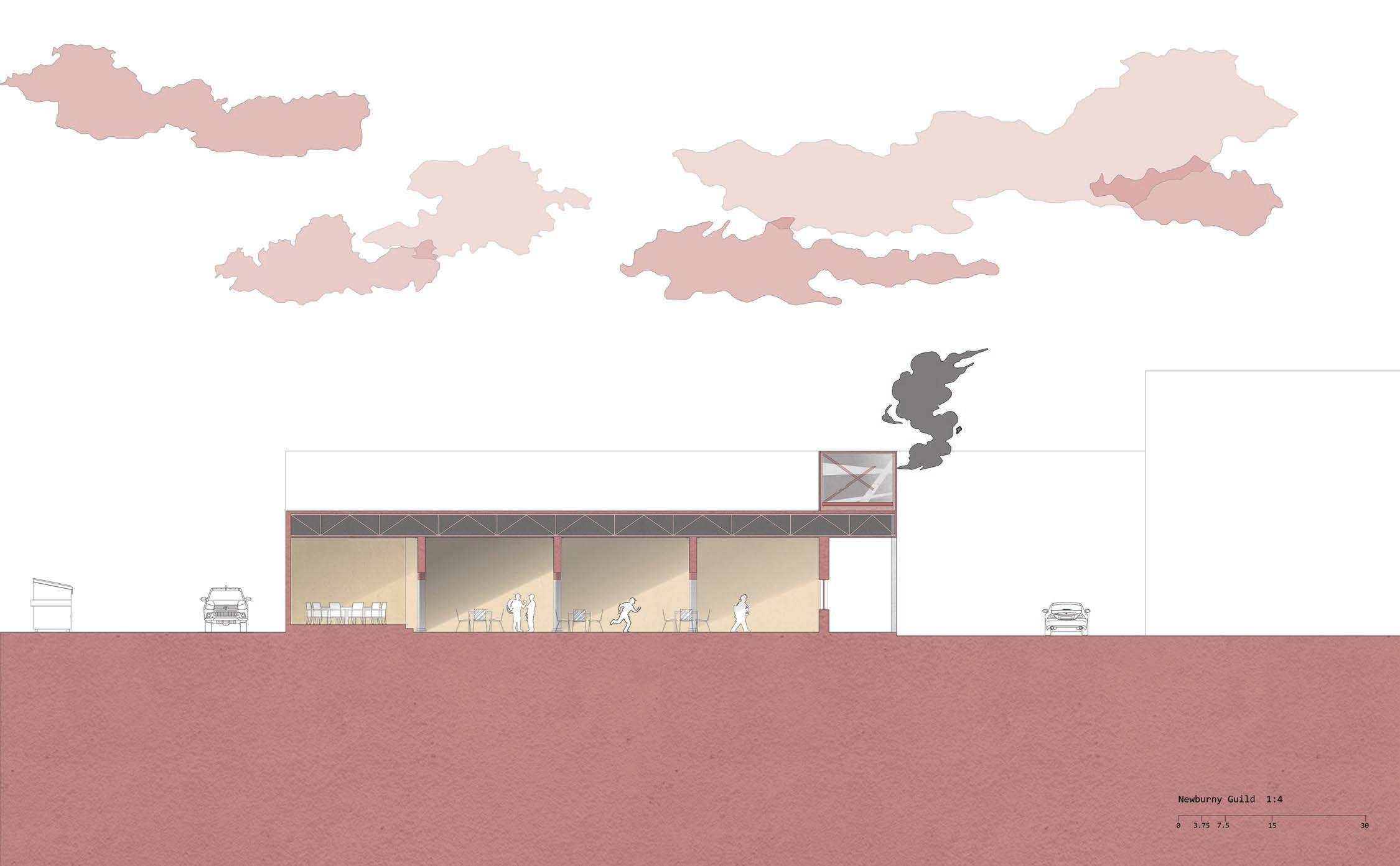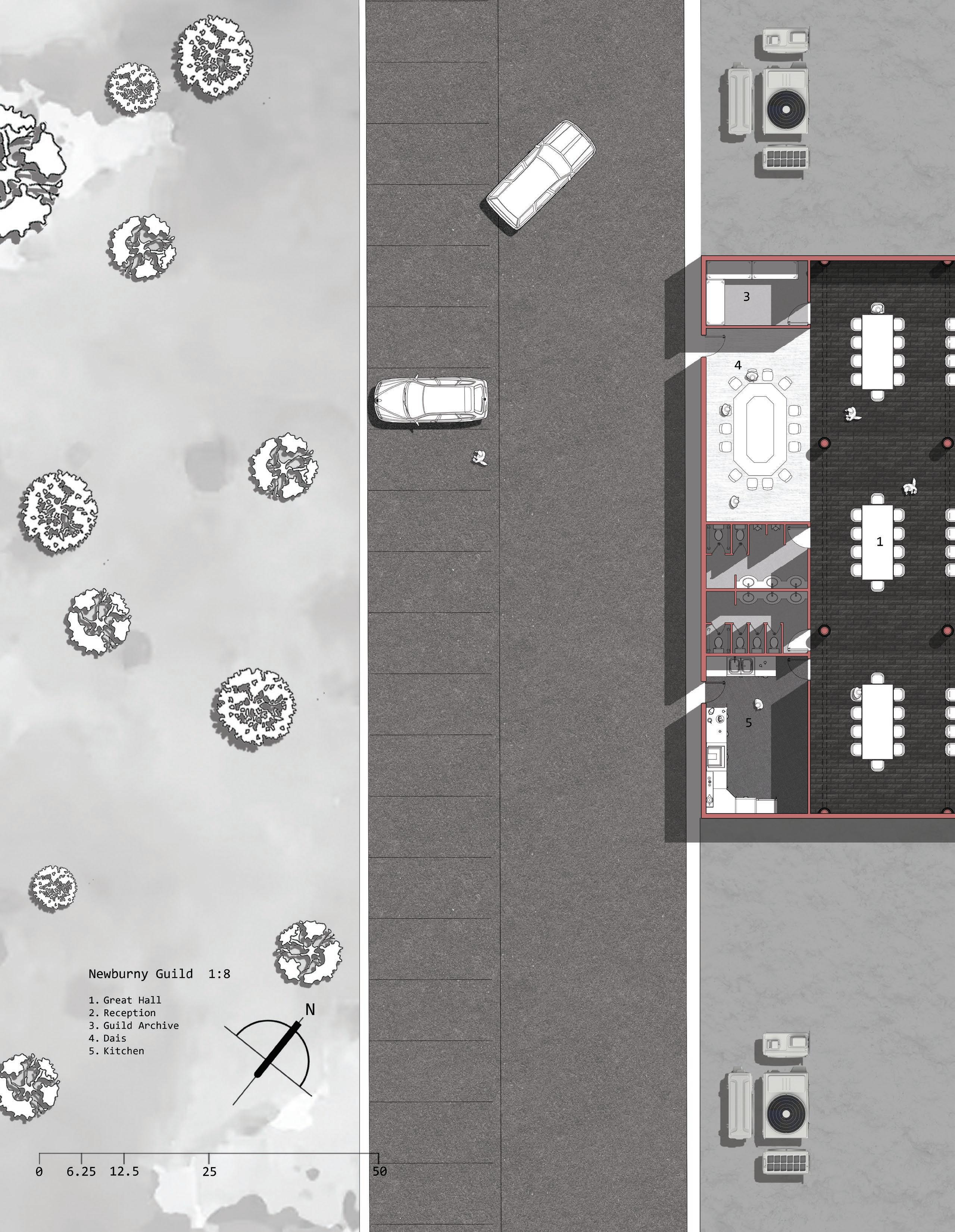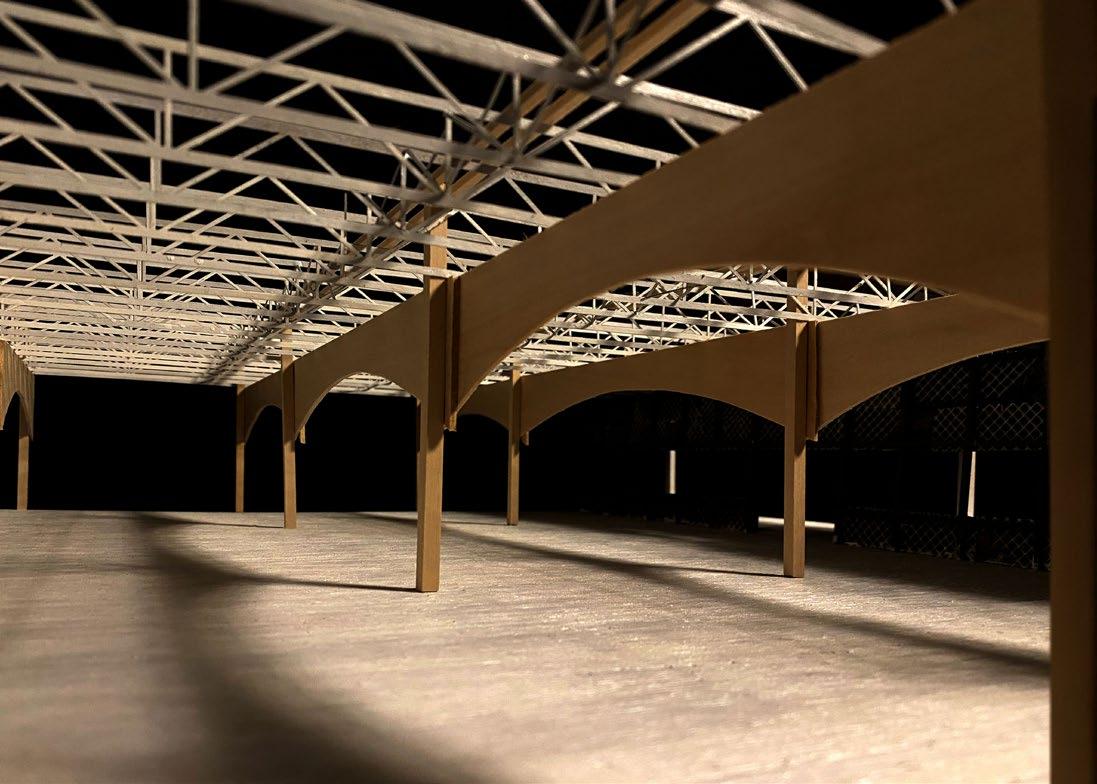 Spanning the interior, a series of arcades structure the space both spatially and symbolically. Architecturally, the arcades establish rhythm, scale, and hierarchy, breaking down the large open volume into legible zones while maintaining visual and communal continuity. They recall medieval guild halls, where arcaded interiors mediated between collective gathering and individual activity. Programmatically, they frame circulation, create moments of pause and encounter, and reinforce the hall’s identity as a shared civic interior. Drawing from medieval guild typologies, the Newburny Guild transforms a banal commercial shell into a resilient social infrastructure, one rooted in service, solidarity, and the enduring value of collective presence.