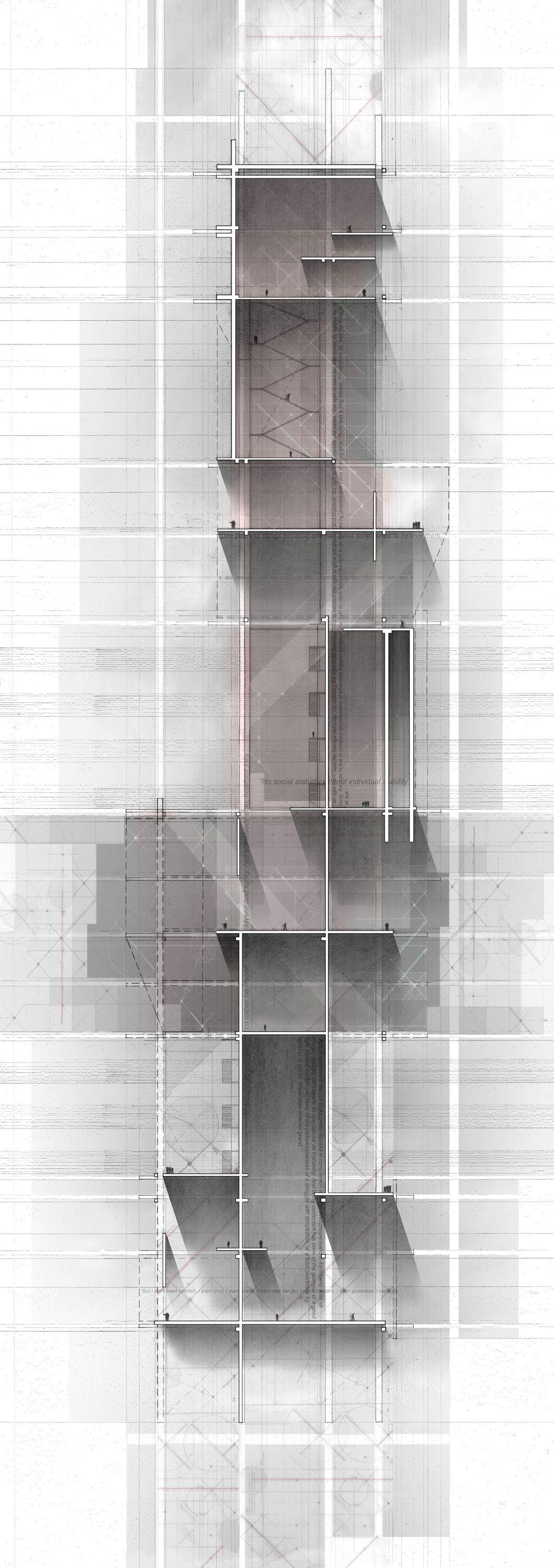 Inspired by Aldous Huxley’s Brave New World, the apex of the tower lies the seat of power, the world government, watchfully surveilling the middle and upper echelons of society, recognizing their potential ability to revolt. Meanwhile, the lowest reaches of the tower, situated at the base of this dystopia, languish in neglect and poverty, their inhabitants are marginalized by systemic indifference, although celebrating a certain sense of freedom...