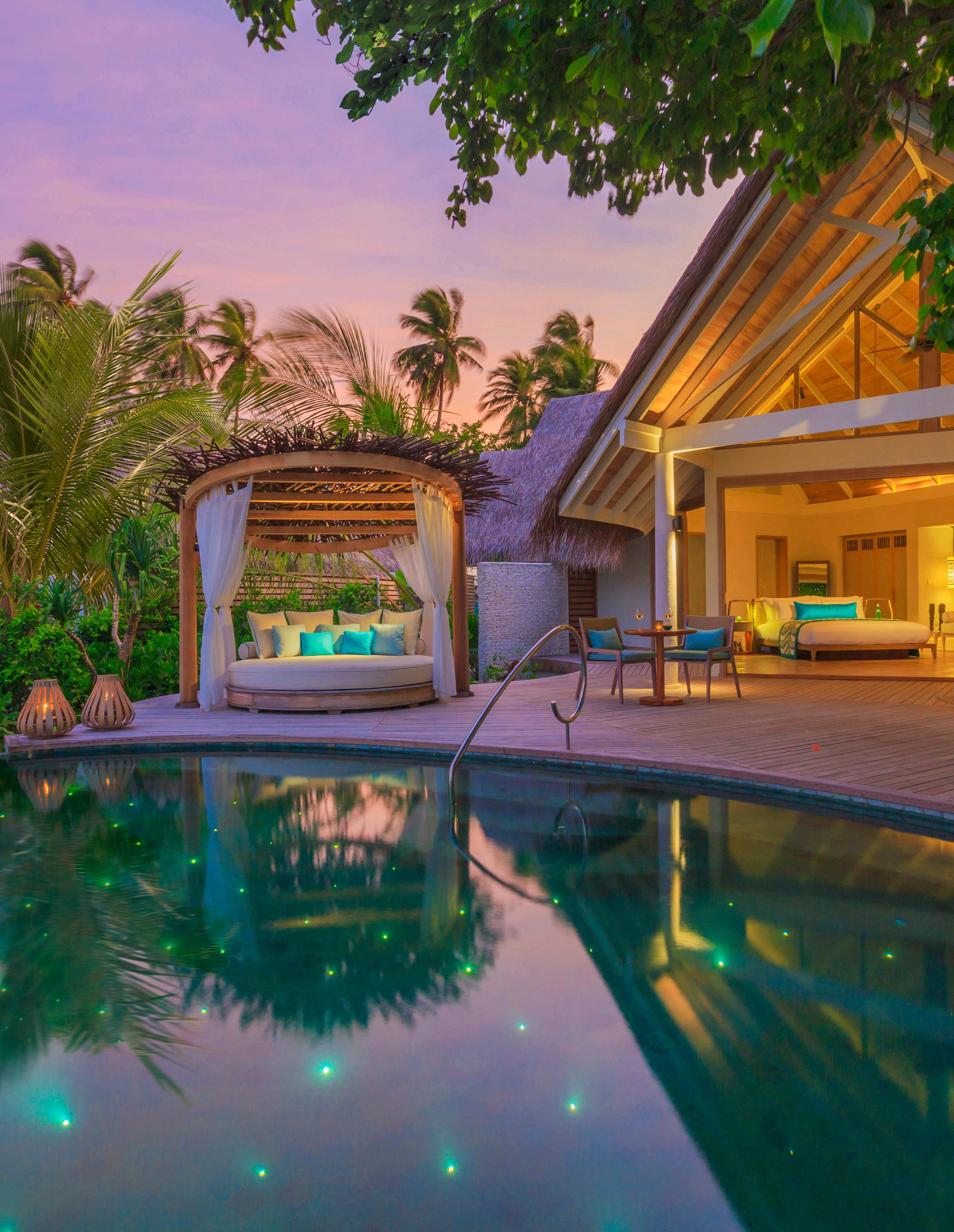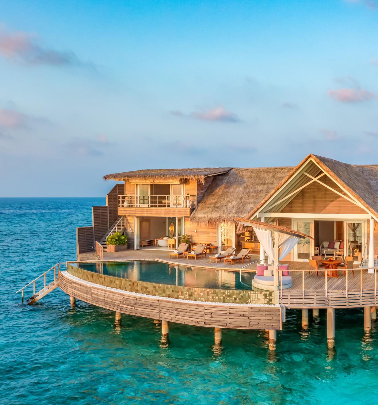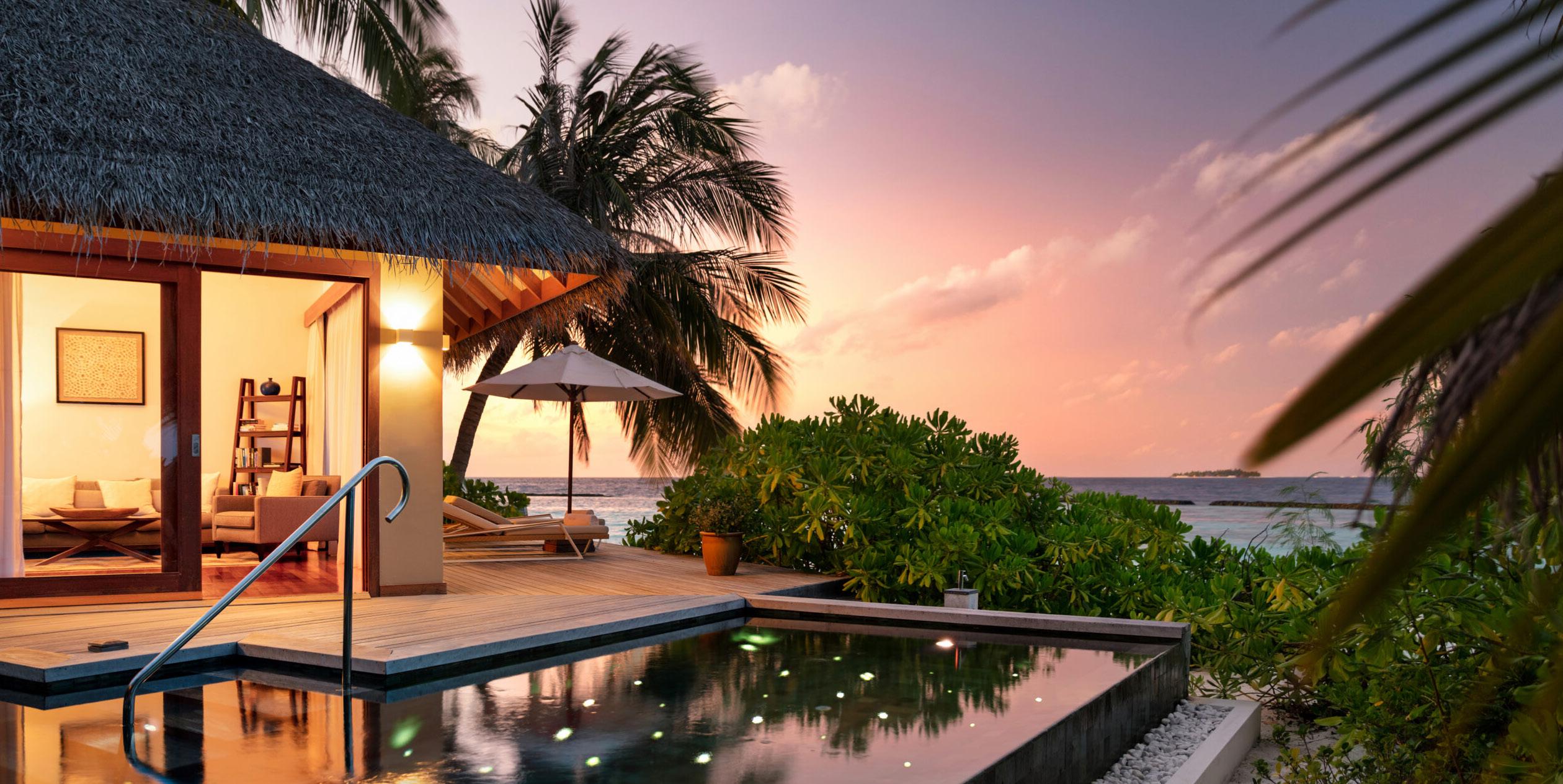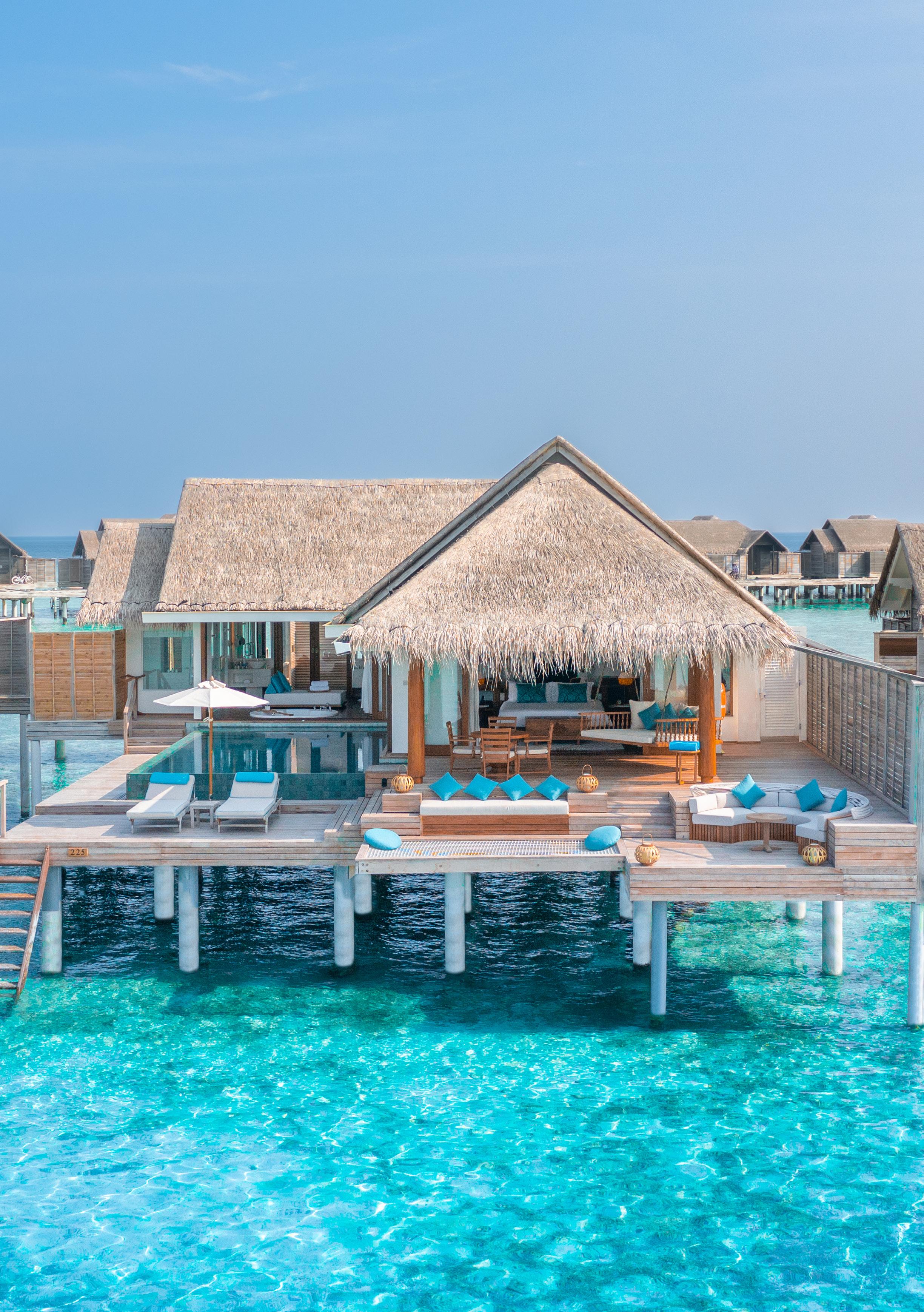 Both Beach and Over Water Villas feature private pools, elegantly thatched roofs with spa-like bathrooms and interiors. Beach Villas feature sunken bathtubs in their luxury outdoor bathrooms, while Sunset Beach Pool Villas are positioned perfectly for golden hour views. Over Water Villas give you direct lagoon access and catamaran nets for unrivalled ocean views.