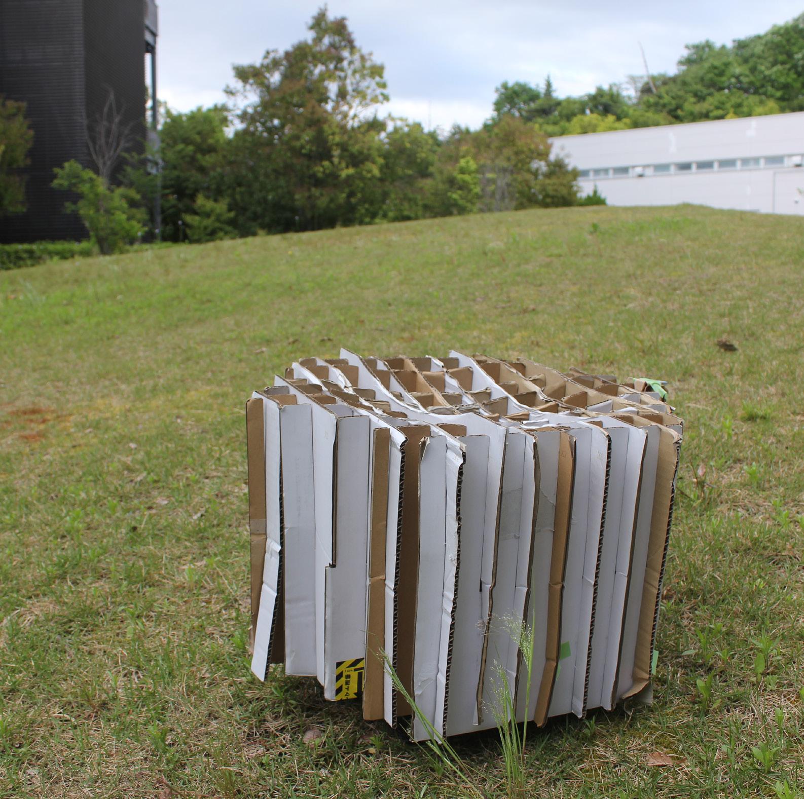 これは地元のイベントでダン ボール家具や動く椅子を展示 した時の風景です。地域の方 から屋外空間で動く家具を使 うことについて、いろいろな 意見をいただきました。とて も面白いアイデアだとは思う のですが、実際にどんなとき に使いたくなるか戸惑うとい う声もありました。こういっ た声を聞きながら改良を重ね ていっています。
