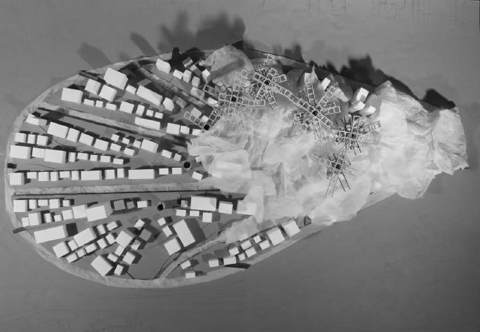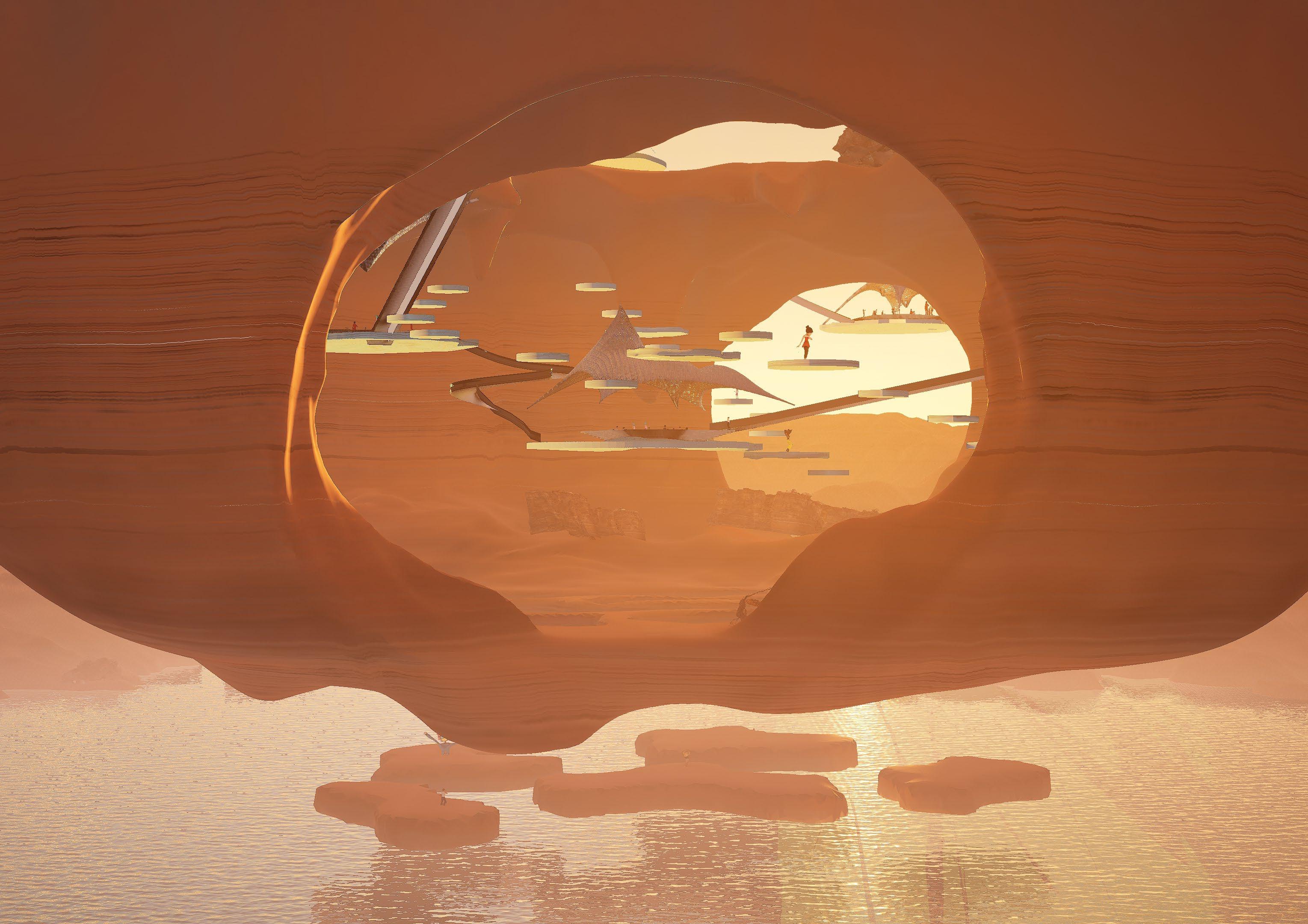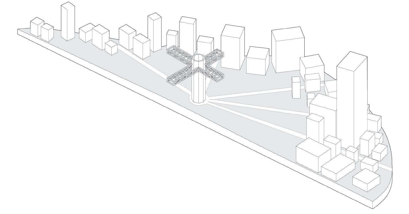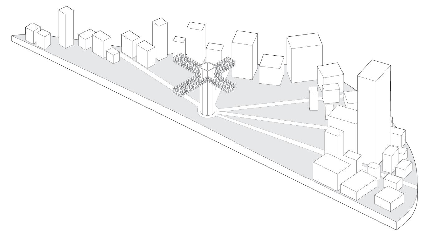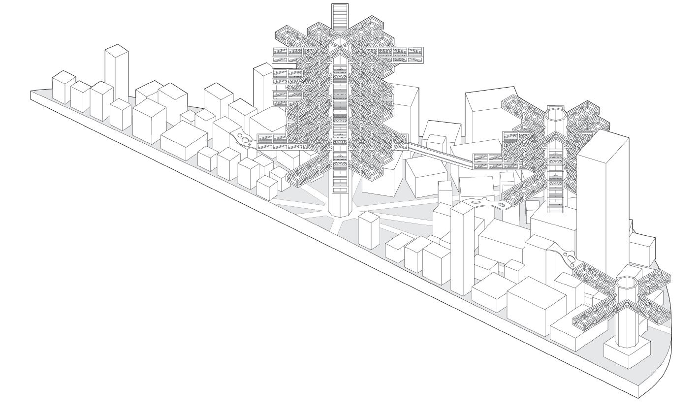 Inhabitants are guided from periphery to the highest point of the island through gradual construction of the main roads. Meanwhile, core the first tower is built. As the ground level gets denser and issue of flooding becomes more important, inhabitants are forced to start to move to the tower.
