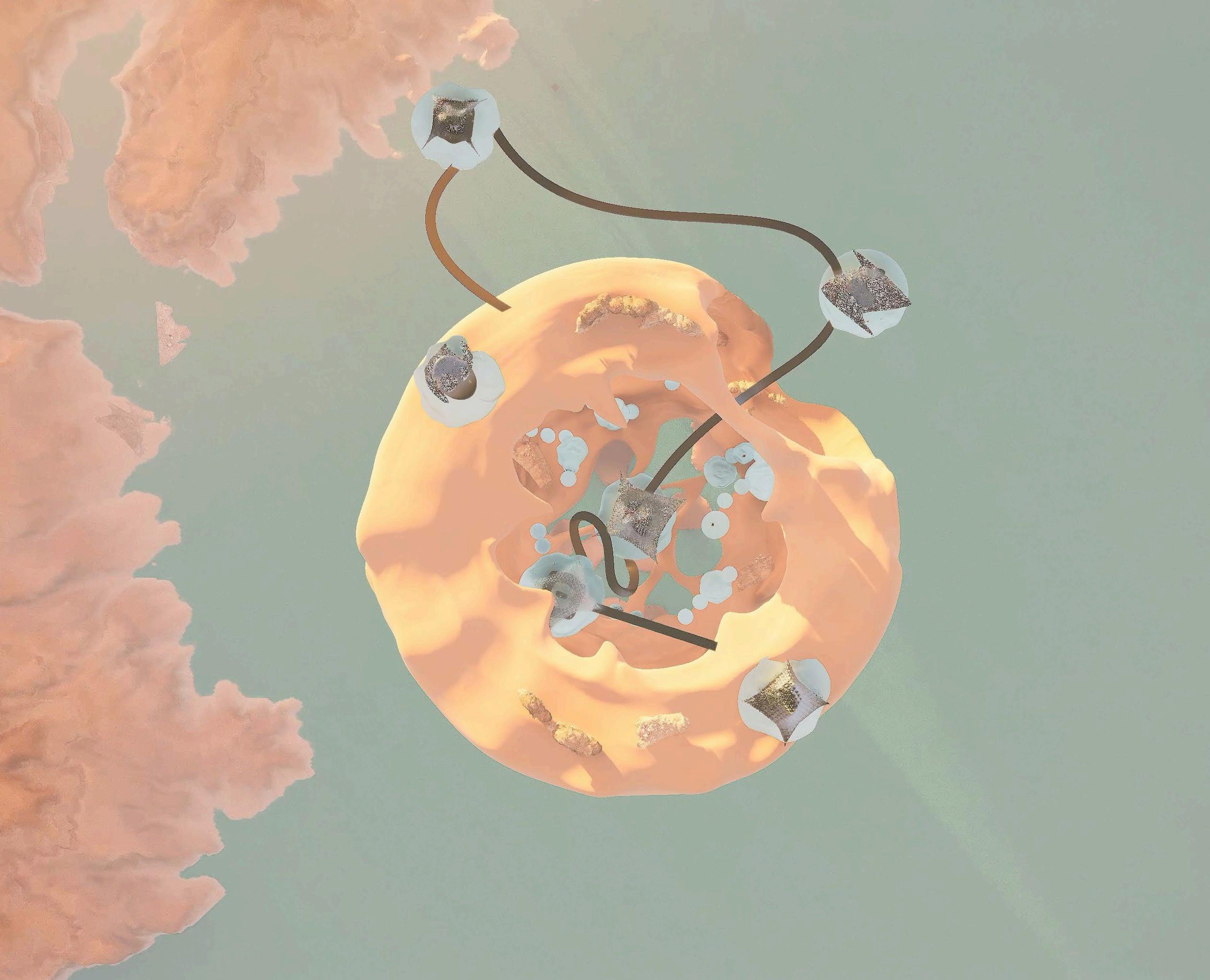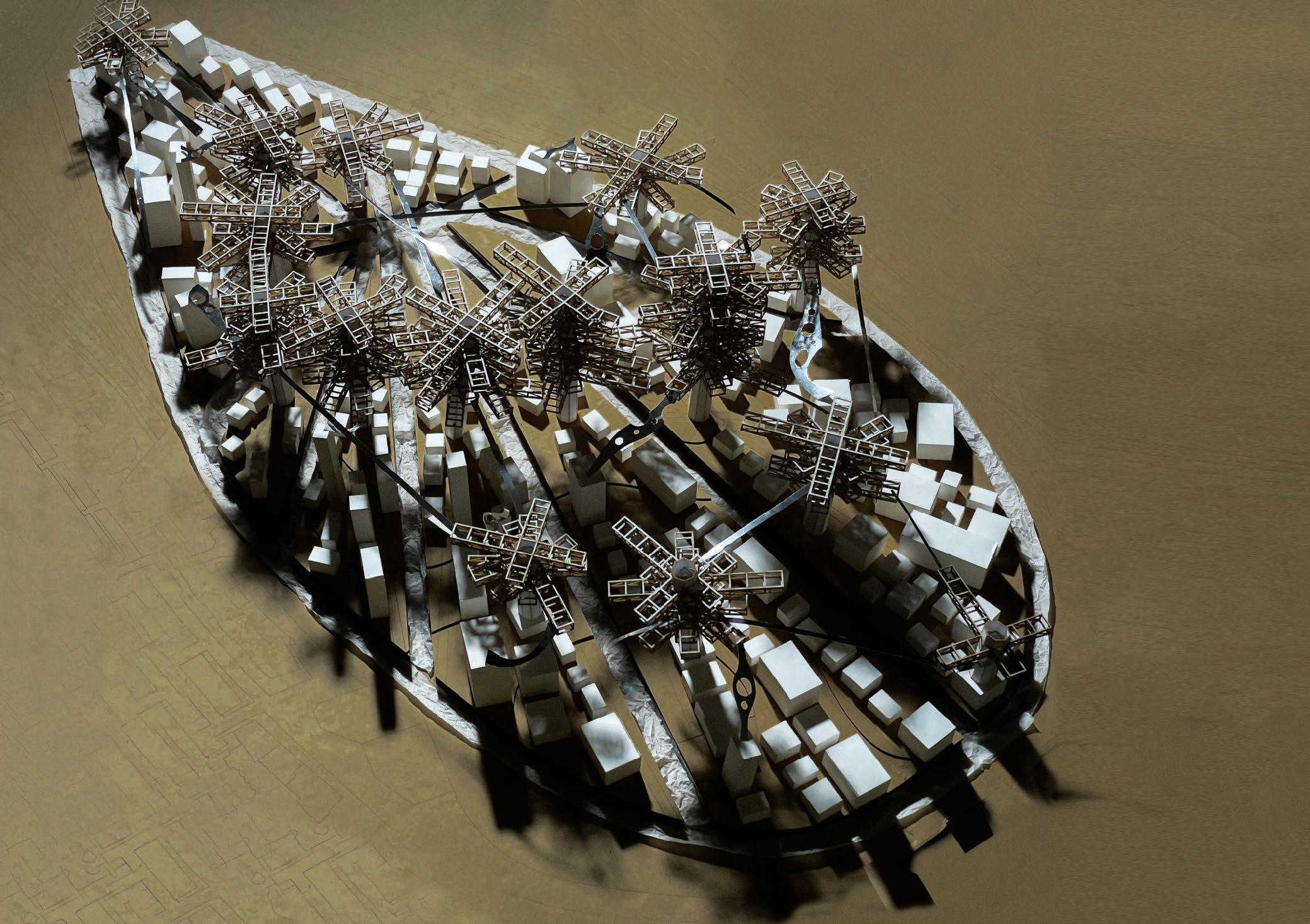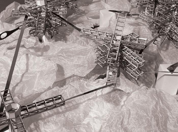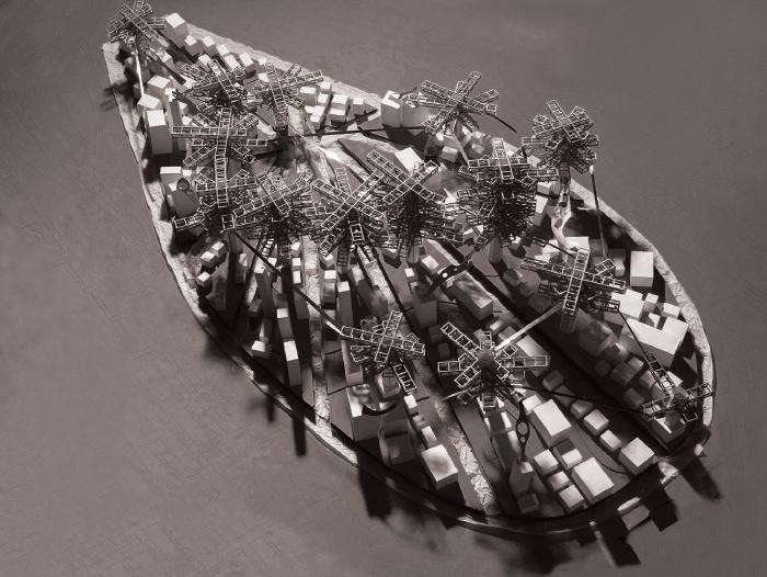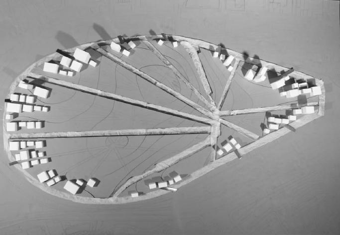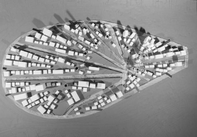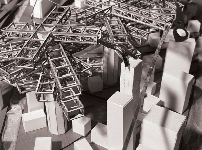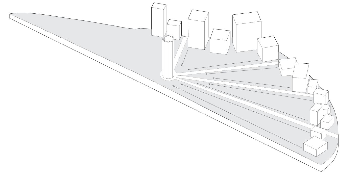 Inhabitants are guided from periphery to the highest point of the island through gradual construction of the main roads. Meanwhile, core the first tower is built. As the ground level gets denser and issue of flooding becomes more important, inhabitants are forced to start to move to the tower.