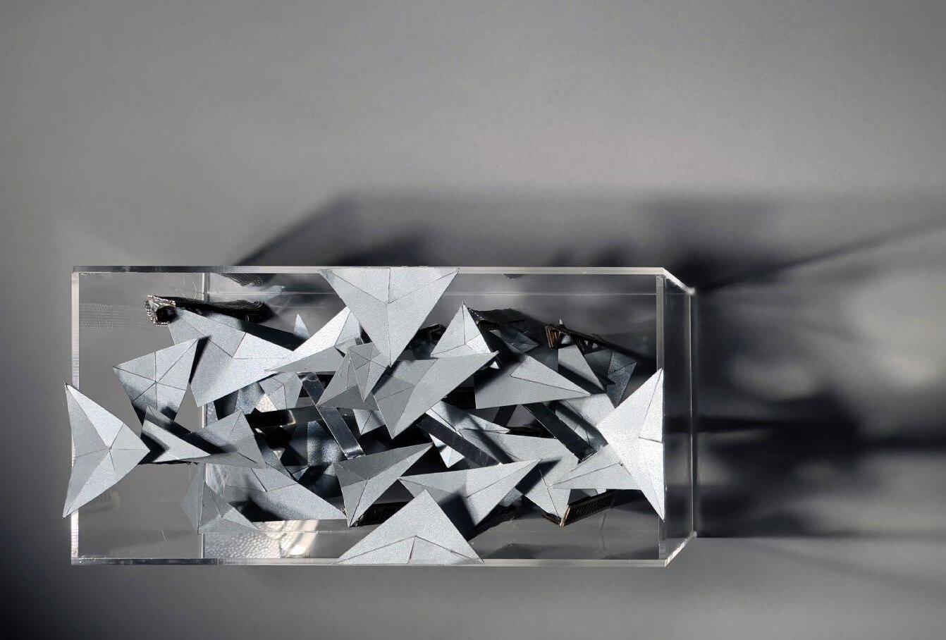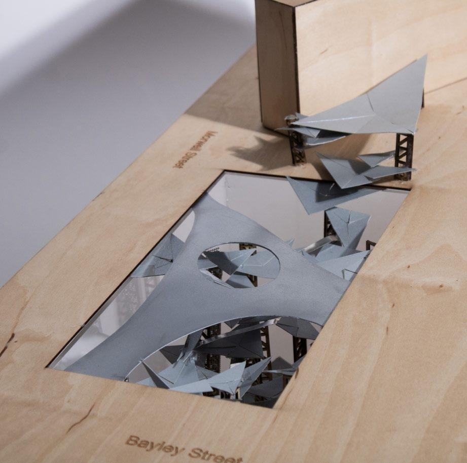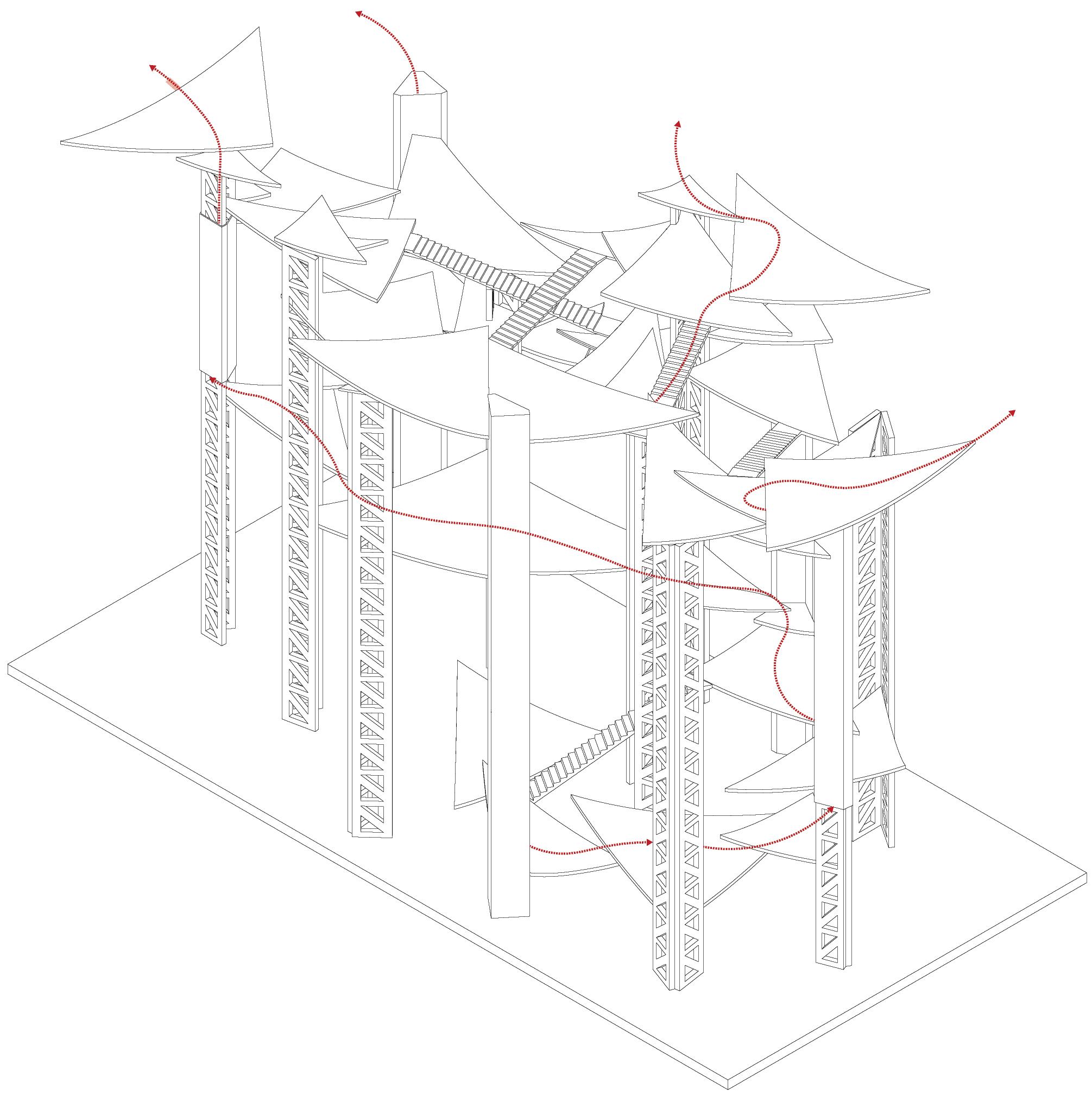 The main concept is derived from raindrops falling between layers of leaves. People can travel freely in-between the layering of “leaves”, allowing for a fluid circulation organization.