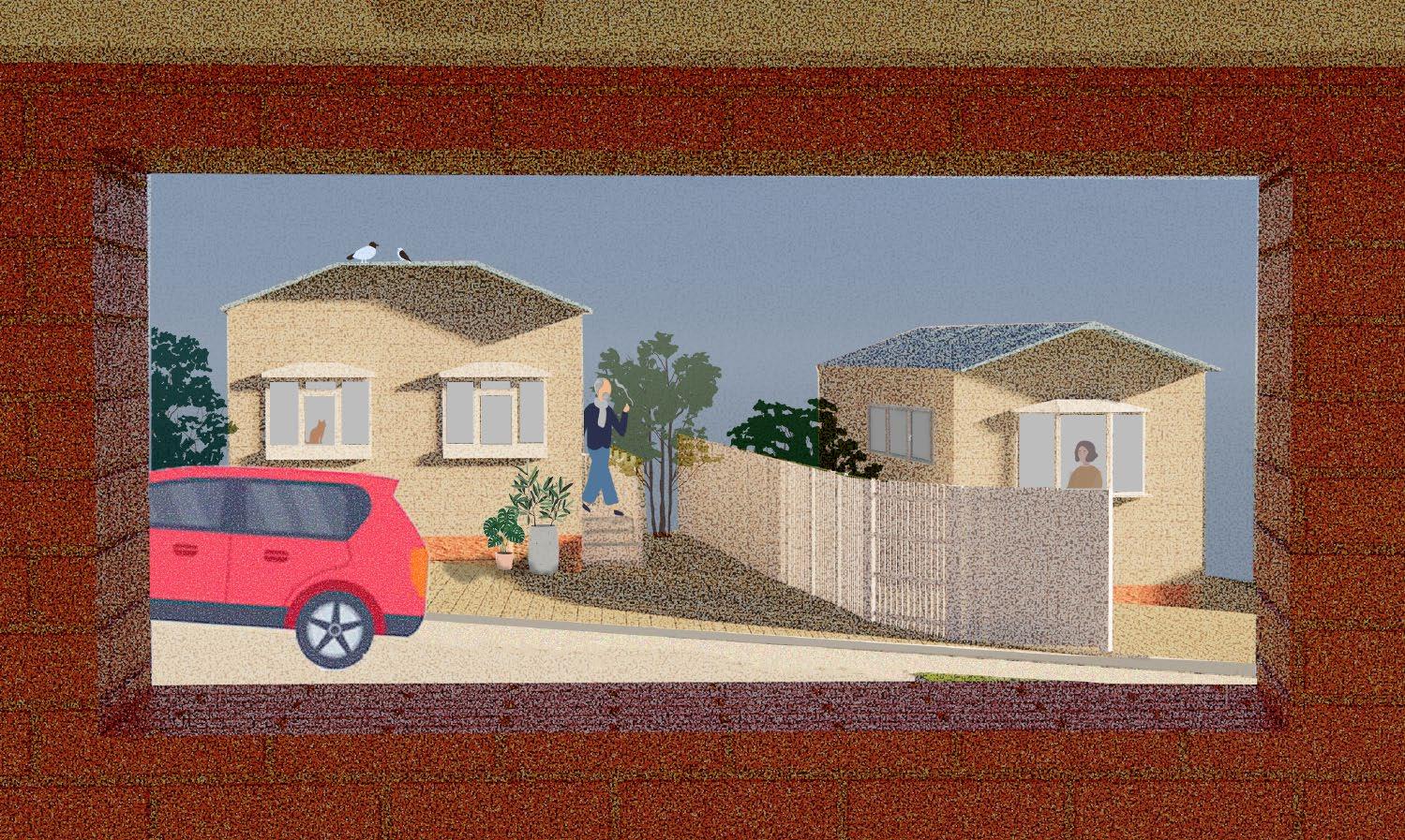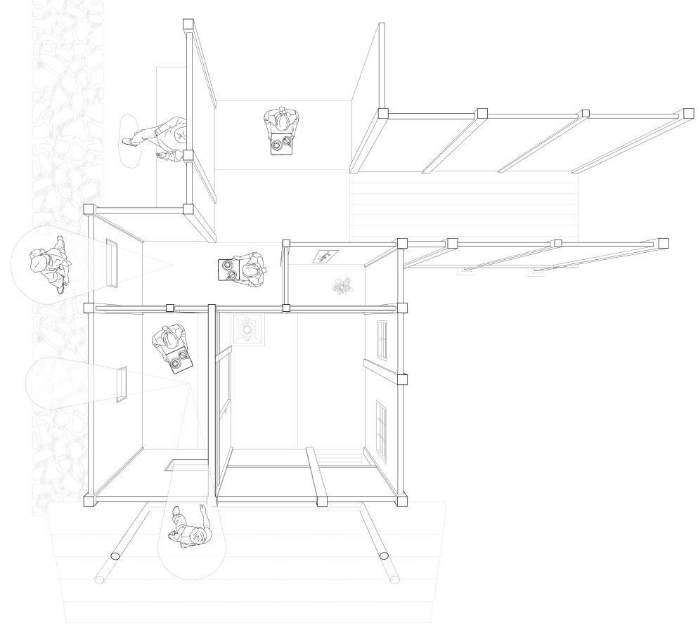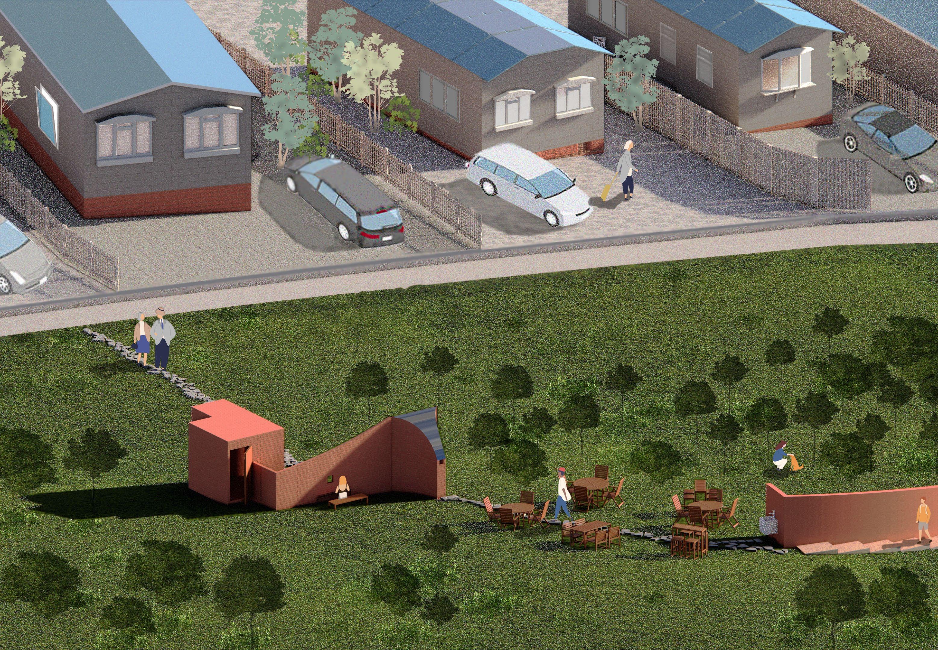 As they walk, the wall will push them to see the 4cm hole in the brick wall, watching the life activities of the residents. The space is gradually opened to them as they emerge into it where they are guided by the door and are led to a low cabin.