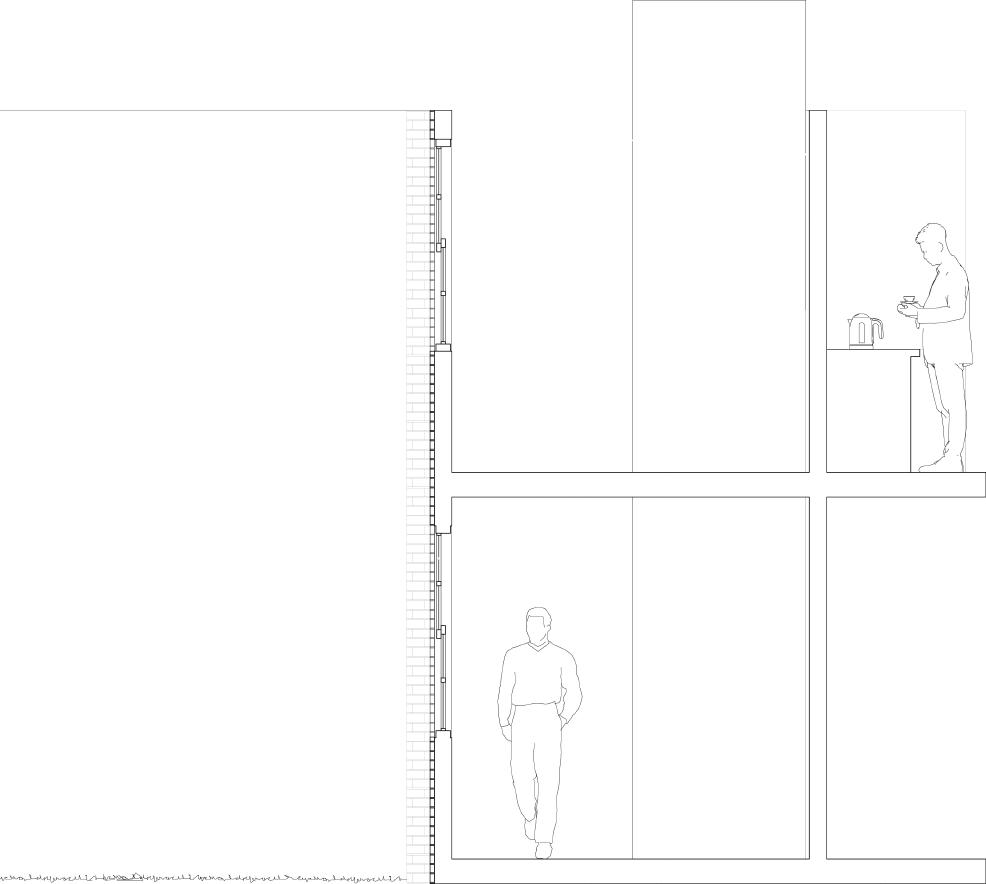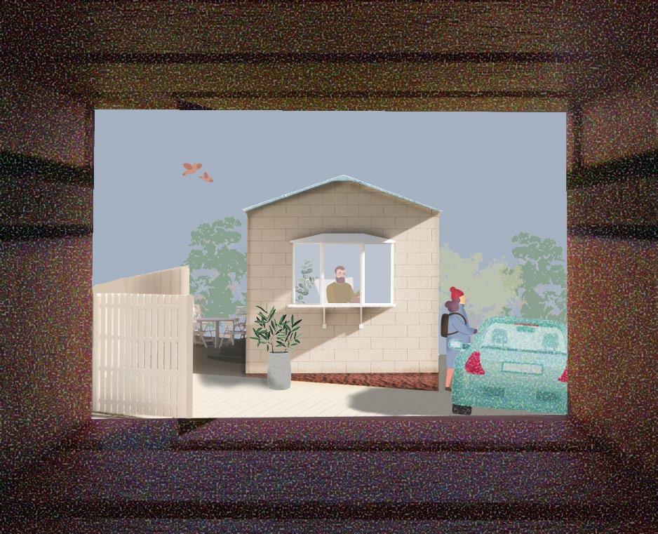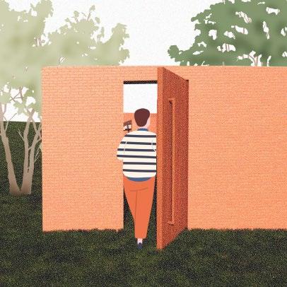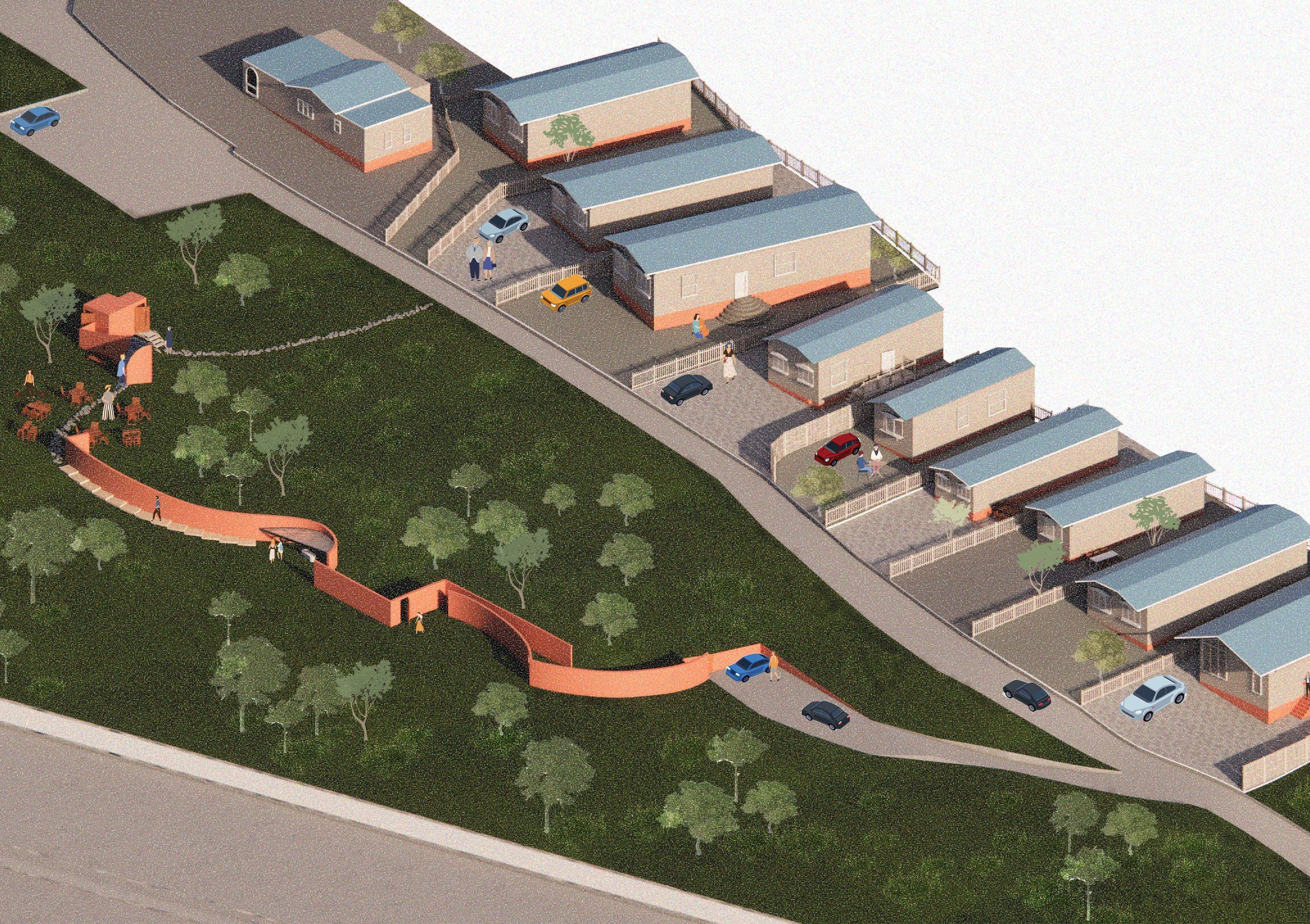 As they walk, the wall will push them to see the 4cm hole in the brick wall, watching the life activities of the residents. The space is gradually opened to them as they emerge into it where they are guided by the door and are led to a low cabin.