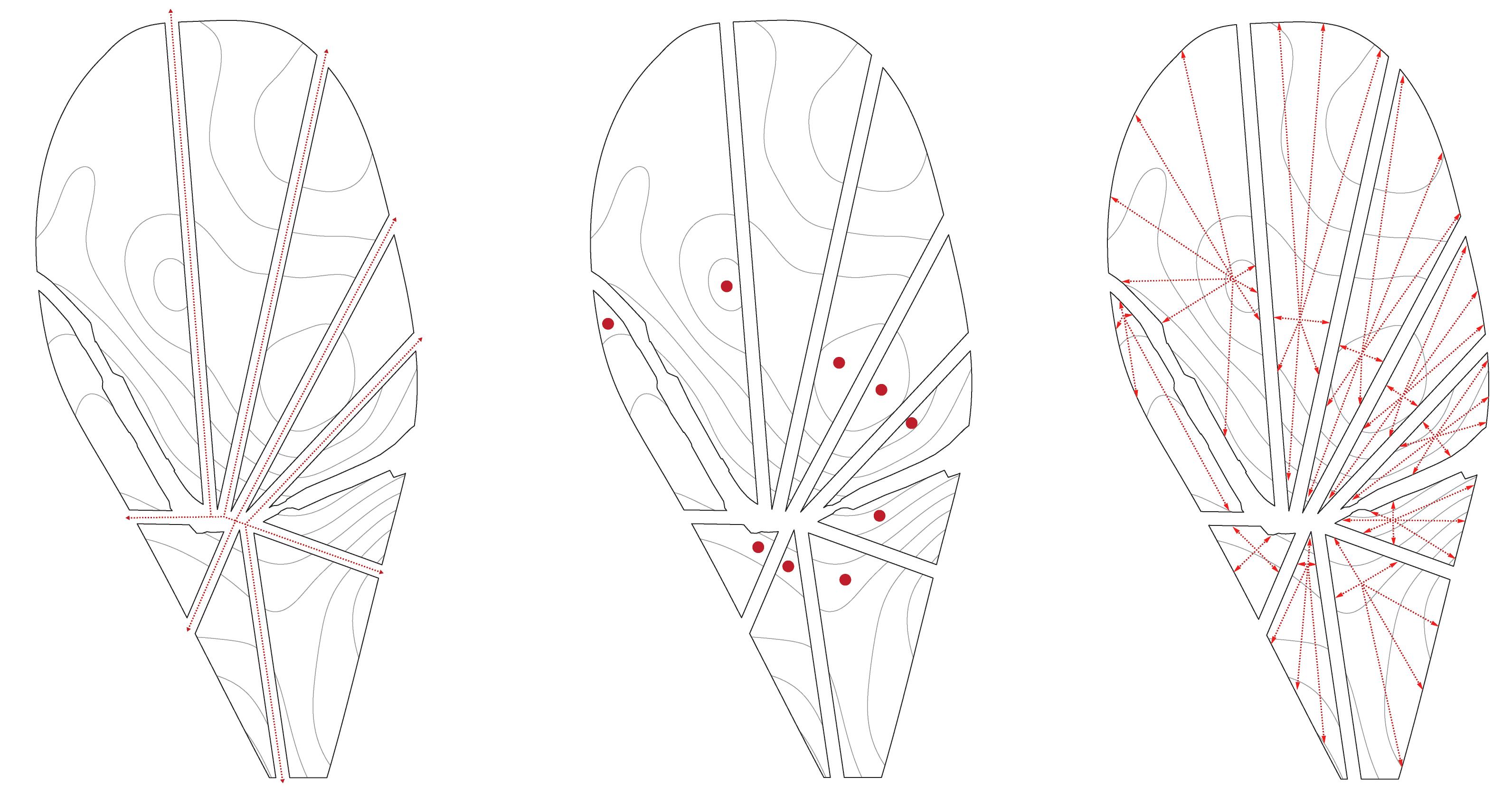 We isolated the whole area with canals and separated it into 10 islands, people will enter the area through bridges. As they gradually populate the area from the edge to the center, there will be cores start to be built in the highest part of each island.