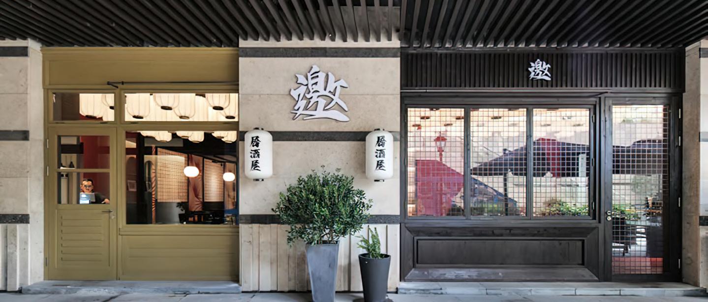 Noren酒柜灵感源来源自日本店铺门帘,“暖帘”一词大约是日本室 町初期从中国传入,是店铺开/关门的标志。在以前,很多居酒屋的 店家在门口用绳子悬挂着暖帘,因此居酒屋也有“绳暖帘”的别称, 这种风格也一直延续到了现在,可见暖帘从遮阳挡风和作为招牌便于 区分居酒屋的分类,逐渐演变成为东方文化的符号之一。