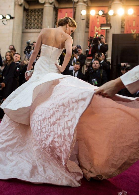 Being nominated as the best actress for her role in “Silver Linings Playbook Jennifer Law rence wore a gown featured a geous voluminous skirt designed by Christian Dior Haute Couture that made her fall on the stairs when she went to pick up her Oscar.