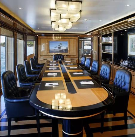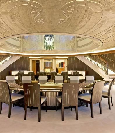 The design of the yacht is unique and complex. The vessel is set apart by its early 19th-century Empirestyle veneered furniture. As well as high-tech security systems and bulletproof primary suite.