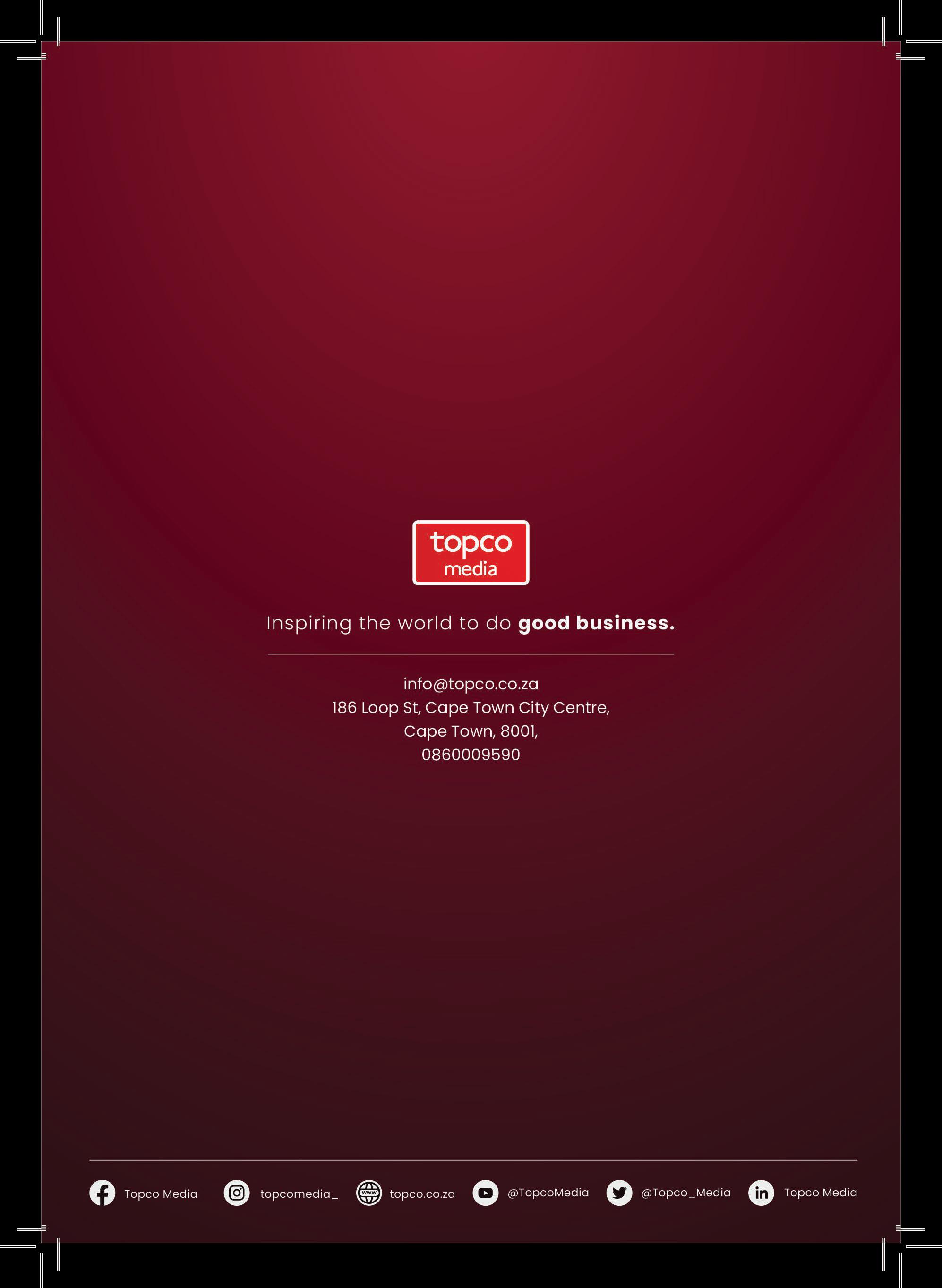 Our unique approach ensures only qualified, eligible, and sustainable top performers are given the opportunity to participate in our publications and events. Our integrity is a fundamental part of Topco’s philosophy and is integral to our internal and external relationships and business practices. As the best in the business-to-business industry in South Africa, trust Topco for your business-to-business publishing, content creation, event production, and advertising needs. n