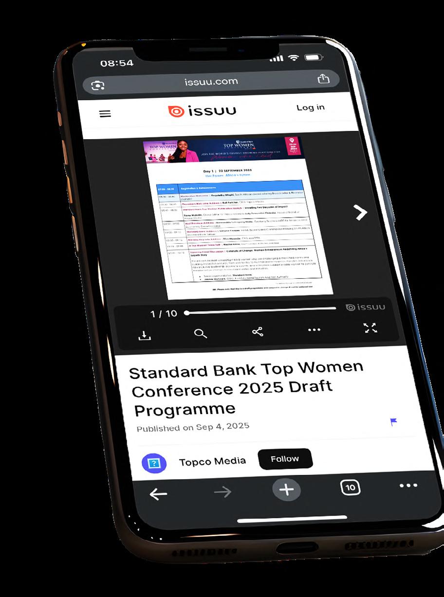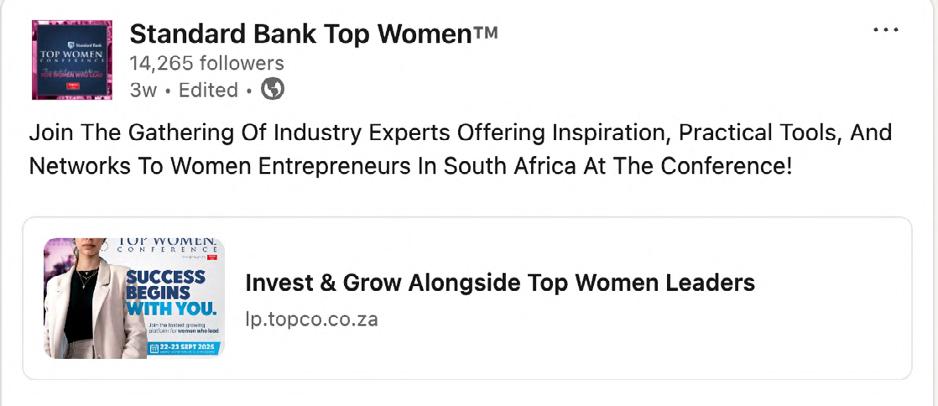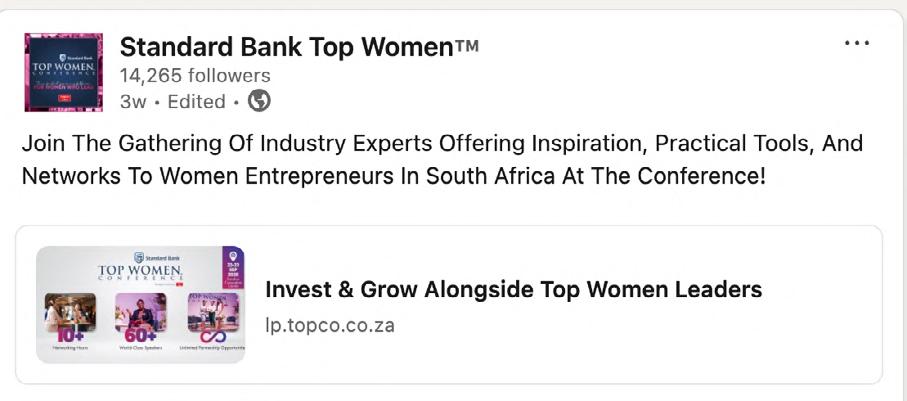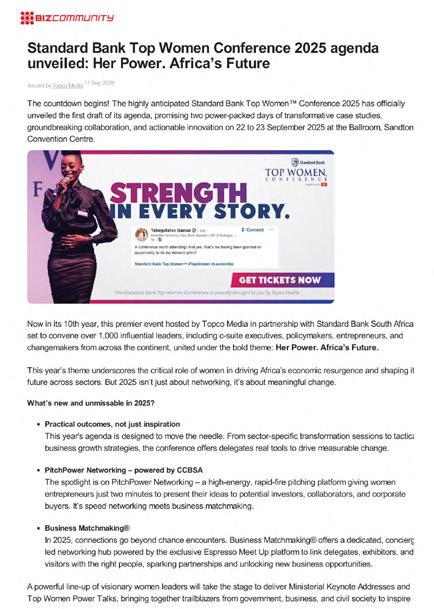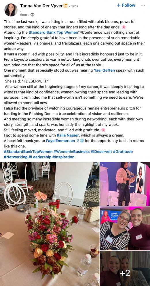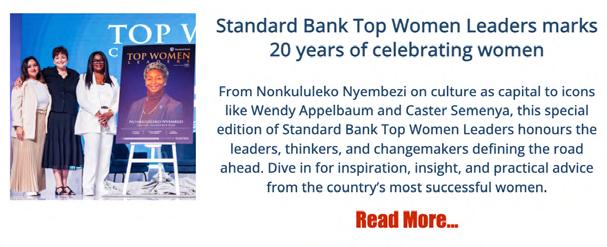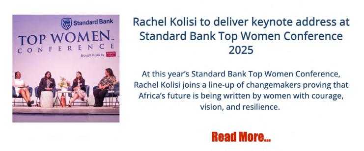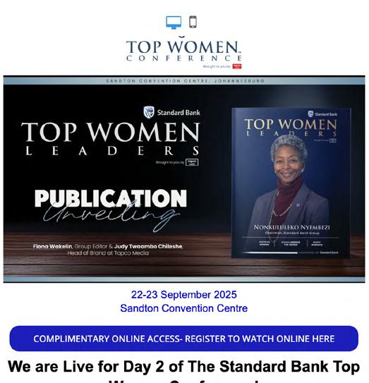 One insight remains constant: the most successful women lift as they rise. Organisations that embrace gender empowerment consistently o§utperform their peers, and men who mentor, advocate for, and invest in women remain vital allies in the journey toward true parity. The Standard Bank Top Women Conference 2025 is more than an event – it is a catalyst for actionable insights, meaningful conversations, powerful connections, and real opportunities to create lasting impact in your career, company, and community.