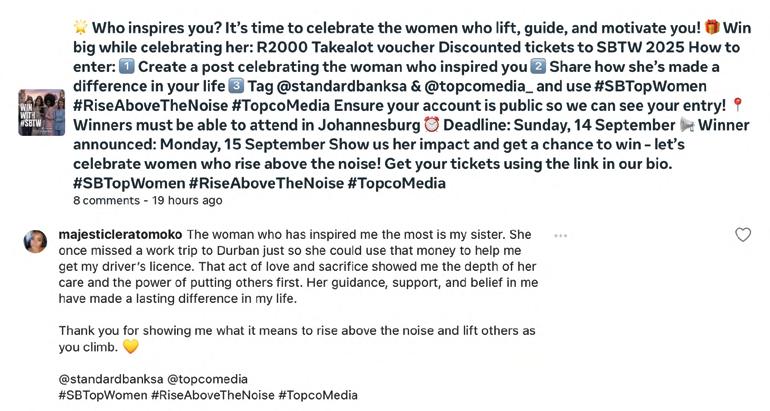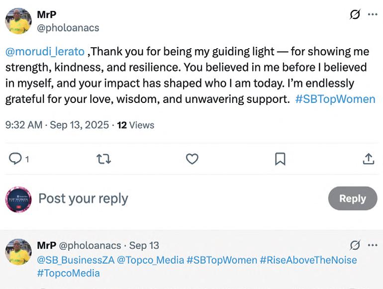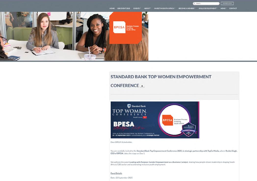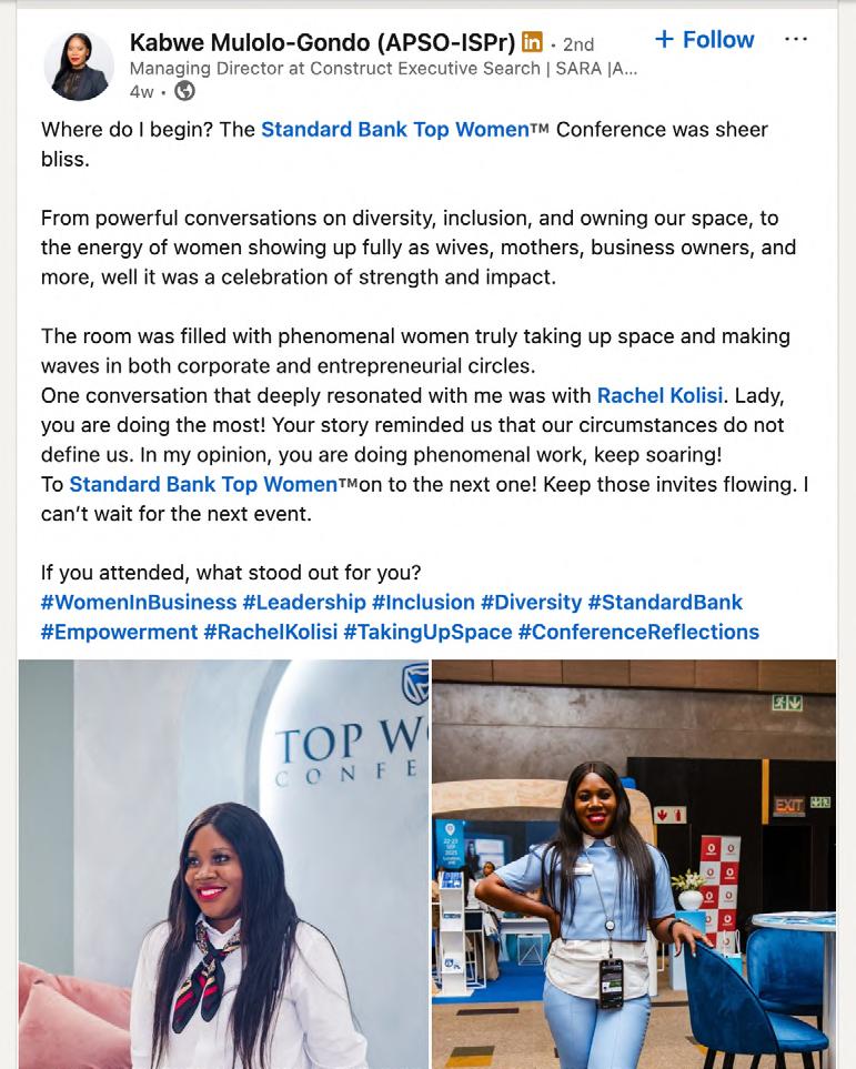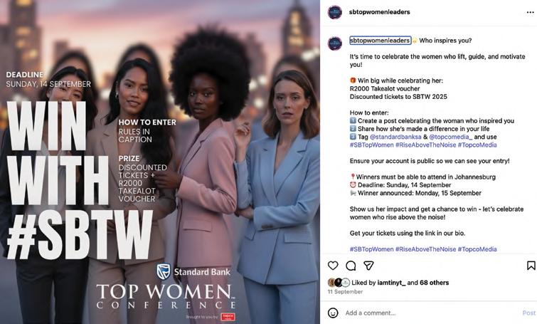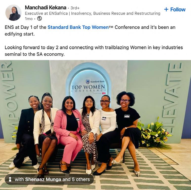 One insight remains constant: the most successful women lift as they rise. Organisations that embrace gender empowerment consistently o§utperform their peers, and men who mentor, advocate for, and invest in women remain vital allies in the journey toward true parity. The Standard Bank Top Women Conference 2025 is more than an event – it is a catalyst for actionable insights, meaningful conversations, powerful connections, and real opportunities to create lasting impact in your career, company, and community.