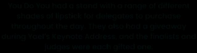 You Do You had a stand with a range of different shades of lipstick for delegates to purchase throughout the day. They also had a giveaway during Yael’s Keynote Address, and the finalists and judges were each gifted one.