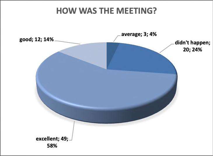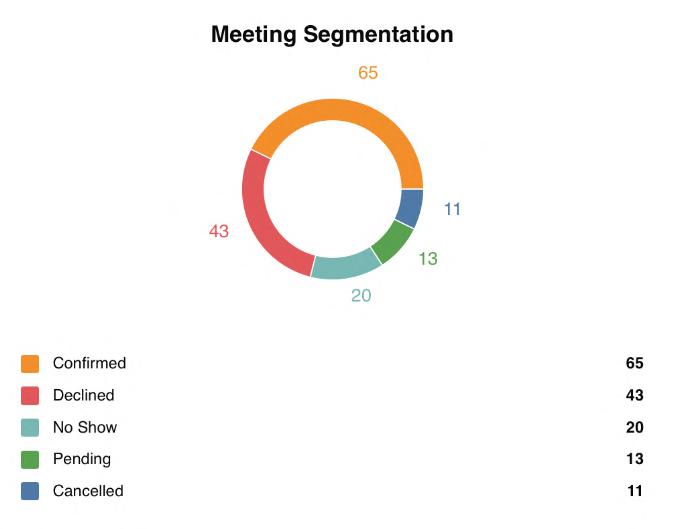 60% of delegates were active in the program. We scheduled 152 meetings in a week pre-show. We achieved an actioned rate of 85% - accepted/declined. Only 13 of the 152 meetings remained pending. 65 meetings were confirmed