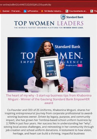 The winners from all the regions are then entered into the annual Standard Bank Top Women Awards and 1 Winner walks home with the trophy and a R100 000 cash prize. n