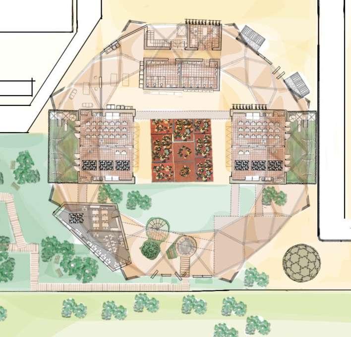 • The dome serves as a unifying structure, with certain buildings or architectural volumes protruding through or engaging with the surface of the dome.