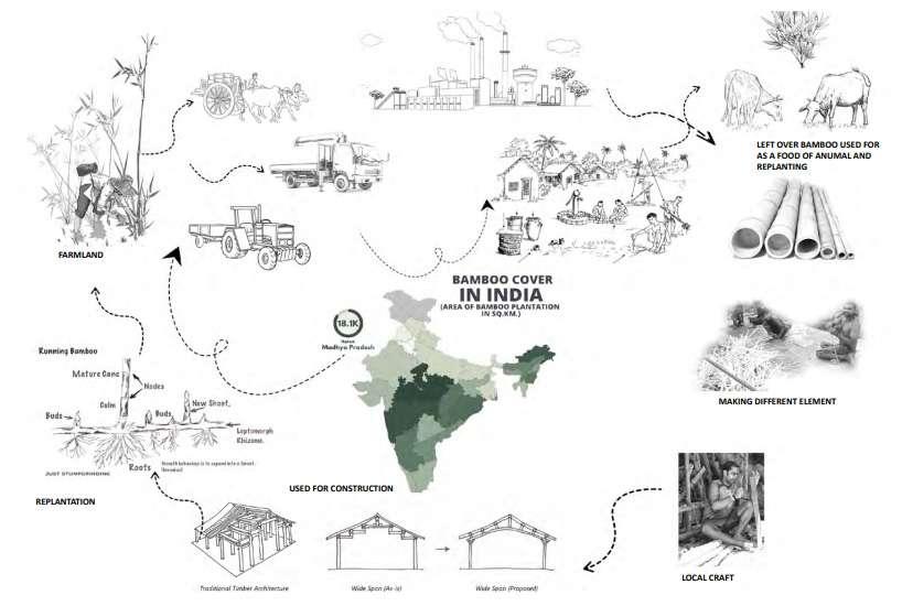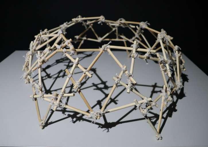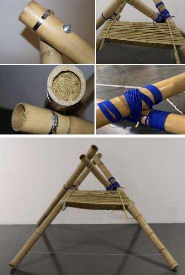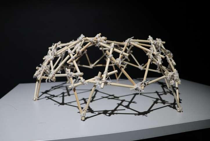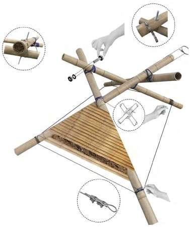 As a group research task we built a full-scale prototype. The team used 4 bamboo pieces to create a roof with an open skylight. Each bamboo member was filled with sugarcrete material and connected using 10mm bolts and rope, and a metal wire was used to maintain stability and its desired shape.