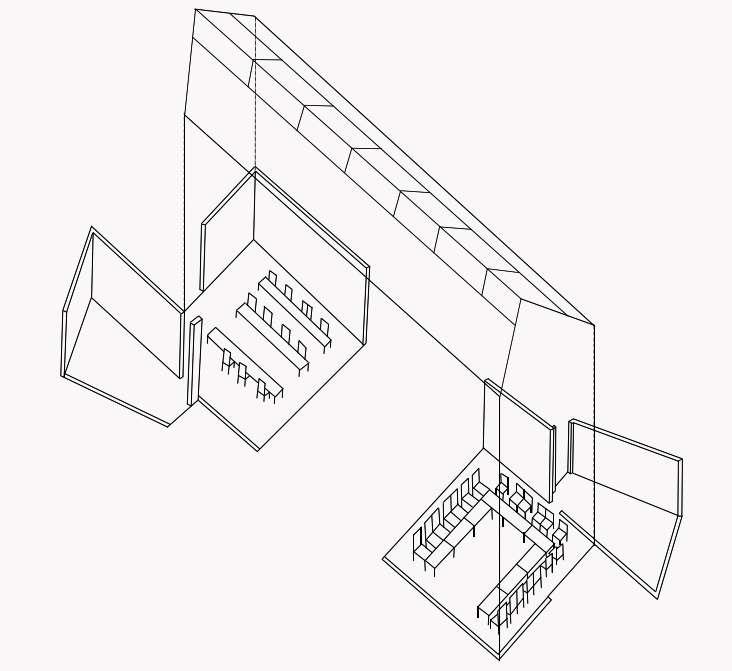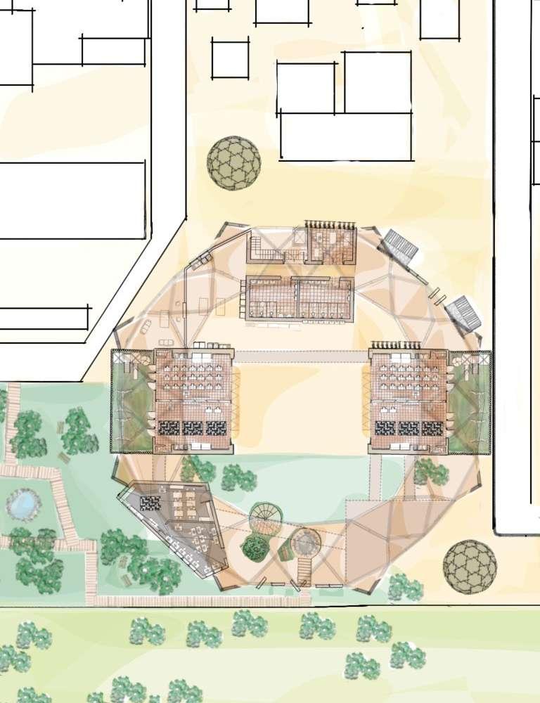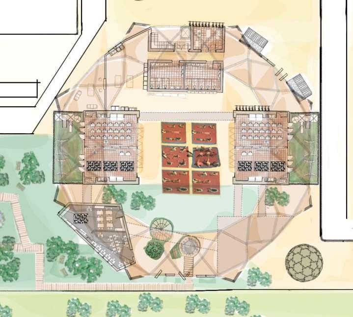 • The intersecting volumes can vary in scale, either as smaller classrooms that partially pierce the dome or larger structures that fully extend beyond it.