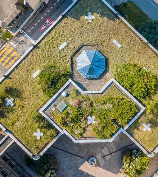 In einem Umfeld, das von versiegelten Flächen und fehlender Vegetation geprägt ist, setzt die begrünte Dachterrasse einen bewussten Kontrast. Sie ist als Aufenthaltsbereich für Mitarbeiter sowie als Ausstellungsfläche für das Unternehmen konzipiert und stellt ein hybrides Element dar, in dem sich Umweltqualität und funktionale Nutzung vereinen.