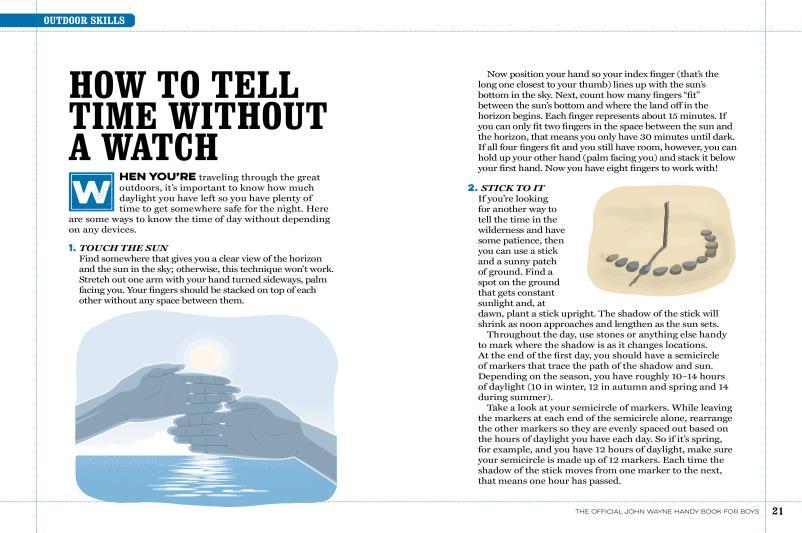 The book includes 100 essential skills, tips, activities and lessons for outdoor fun, responsible, safe adventures and real-world competence. Lessons are fully explained and enhanced with full color step-by-step illustrations where needed. From camping and fishing to managing their money and everything in between, readers will discover four big sections covering a range of topics, including Outdoor Skills, Self-Sufficiency at Home, Acting Upwards and Fun & Games. They’ll learn how to:
