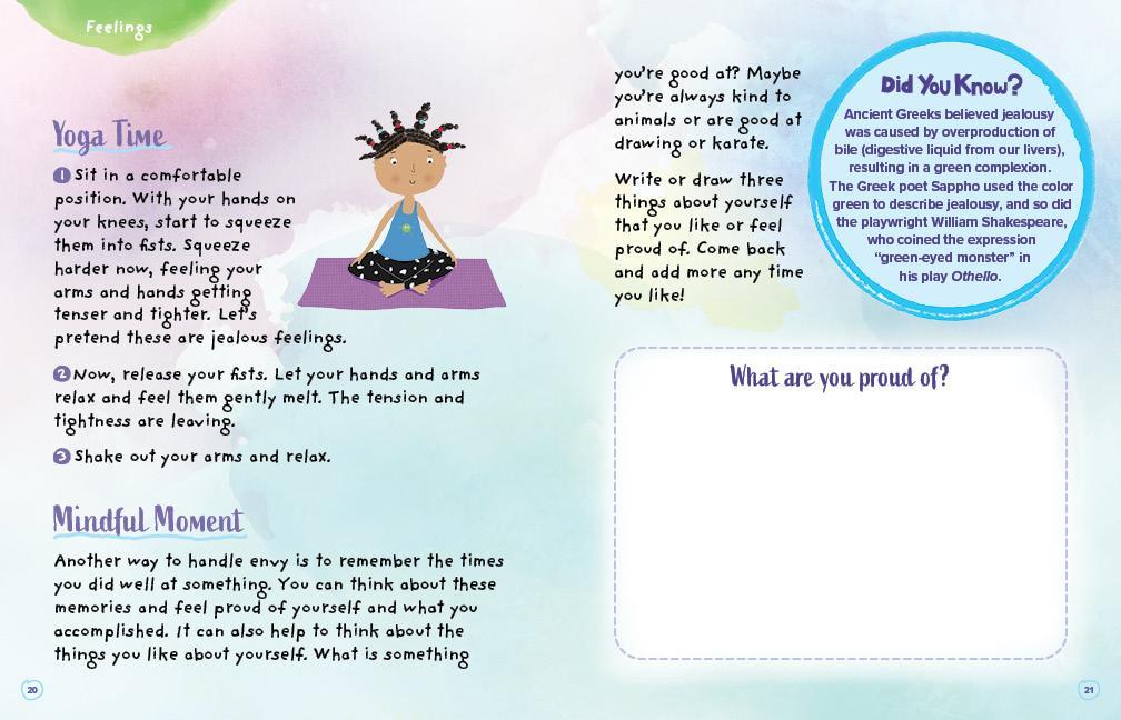 Peace Out: Calm Down Workbook for Kids is a collection of relaxation stories for children that focuses on mindfulness and imagination to teach social-emotional skills. The vibe is calm and friendly, providing a safe space for kids to relax. The author speaks directly to her readers children and their parents. Her approach has always been to speak to children as if they are curious and capable because they are! The book includes 40 small sections, with each section including a two page story designed to help kids calm down, relax and think creatively about various interesting subjects, followed by a yoga relaxation exercise and a mindful "moment" to help them control their thoughts and emotions.