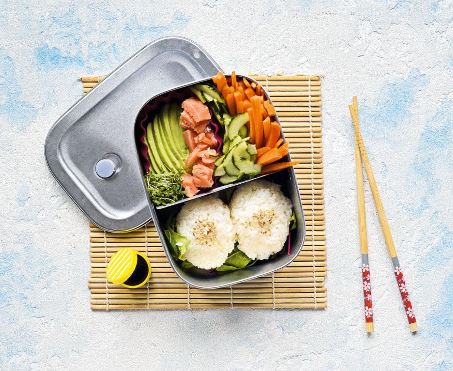schneiden und mit 1 TL Zitronensaft beträufeln. 100 g Räucherlachsscheiben in Streifen schneiden. 25 g Kresse waschen. EssigMix unter den Reis rühren. Reis mit angefeuchteten Händen zu 4 Bällen formen. In zwei mit Salatblättern ausgelegte Bentoboxen legen und mit 1 TL geröstetem Sesam bestreuen. Vorbereitete Zutaten auf die Boxen verteilen. Sojasauce in einem Extrabehälter mitnehmen.