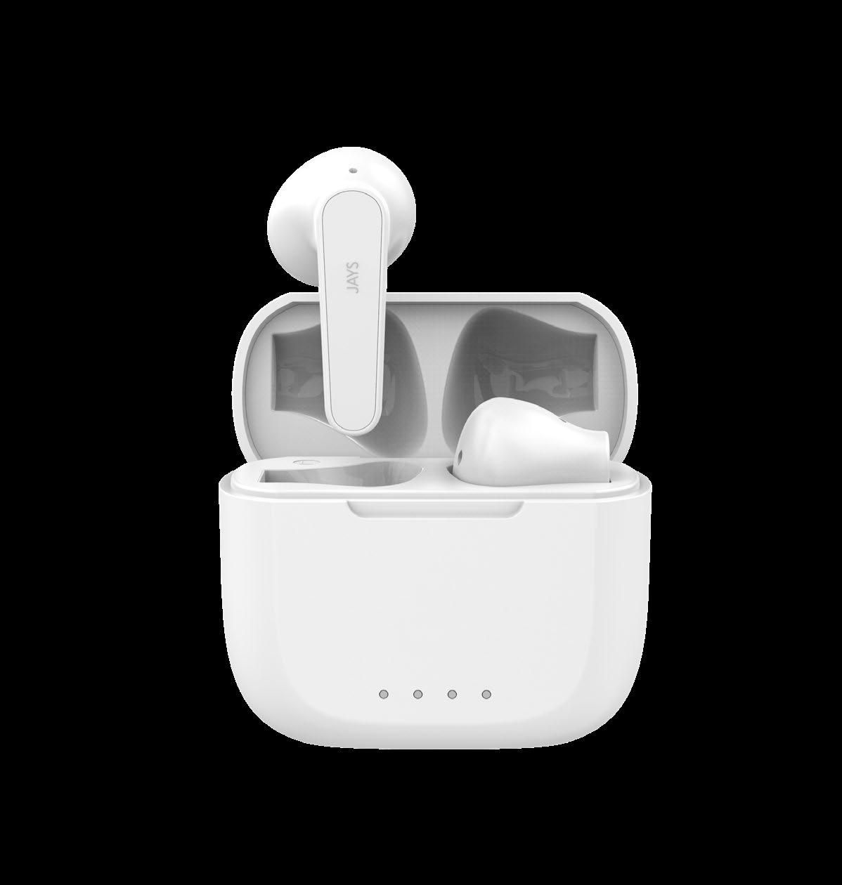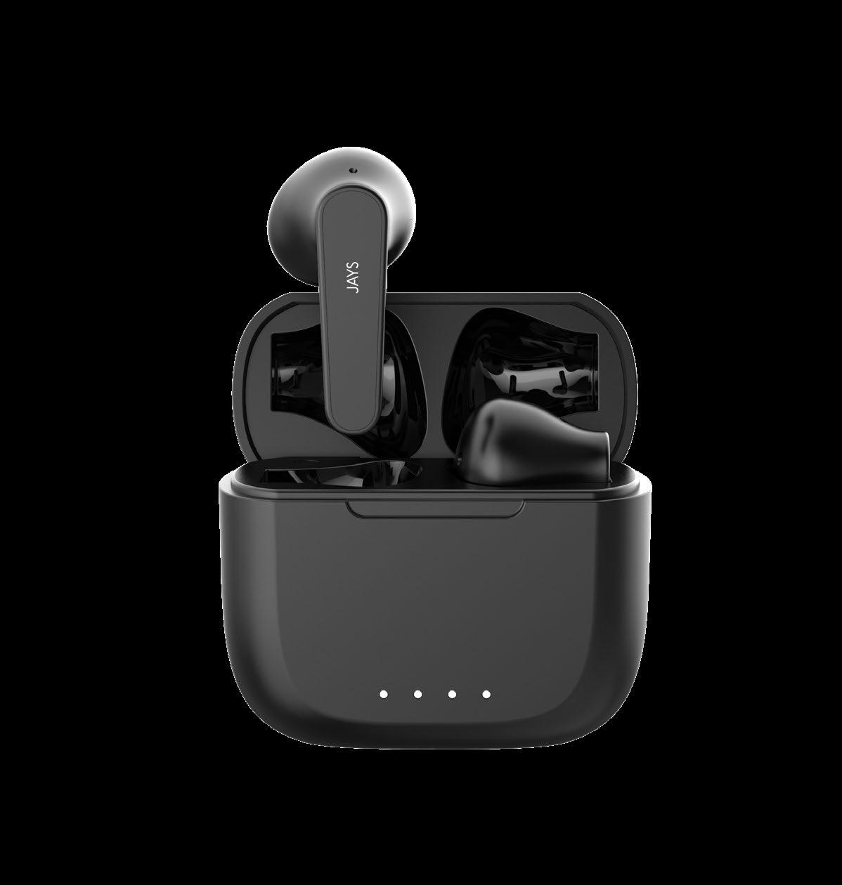 These ergonomic wireless earphones from Jays feature superior call quality and a perfect fit due to the different silicone ear tips. It comes with a superior microphone for clear conversations. With up to 4 hours of playtime on a single charge and three additional charges in the charging case. Size: 43x30x62mm