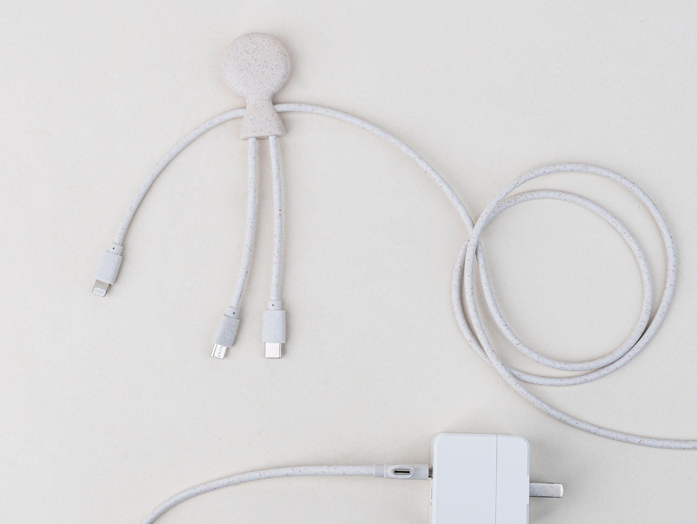 Mr. Bio Cork is our newest multi-charging cable, with a dual USB & USB-C input connector and three connectors to charge your devices. It is made from cork and DuPont Tyvek cables. It comes packaged in a stylish, sustainable FSC paper envelope. Size: 150x255x10mm