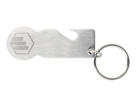 Nyckelring med flasköppnare tillverkad av återvunnen aluminium och 5 små karbinhake-liknande krokar för att organisera dina nycklar. En praktisk och mer miljömedveten accessoar för vardagsbruk.