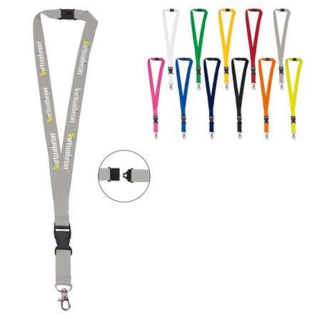Nyckelband i polyester med säkerhetsspänne både fram och bak samt metallkrok. Lagervara (för andra utföranden se specialdesign).
