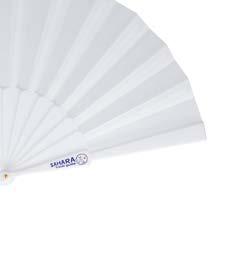 Handfläkt gjord av plast och polyester. Finns i olika ljusa färger, perfekt för utomhusevenemang och varma sommardagar.